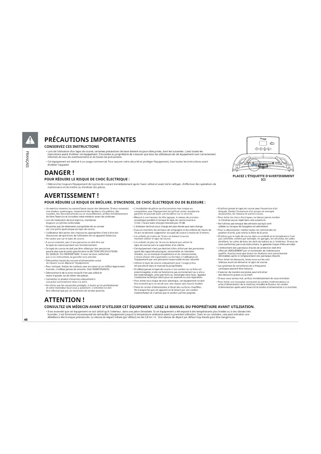 - Lors de l'utilisation d'un tapis de course, certaines précautions de base doivent toujours être prises, dont les suivantes : Lisez toutes les instructions avant d'utiliser cet équipement. Il incombe au propriétaire de s'assurer que tous les utilisateurs de cet équipement sont correctement informés de tous les avertissements et de toutes les précautions.
