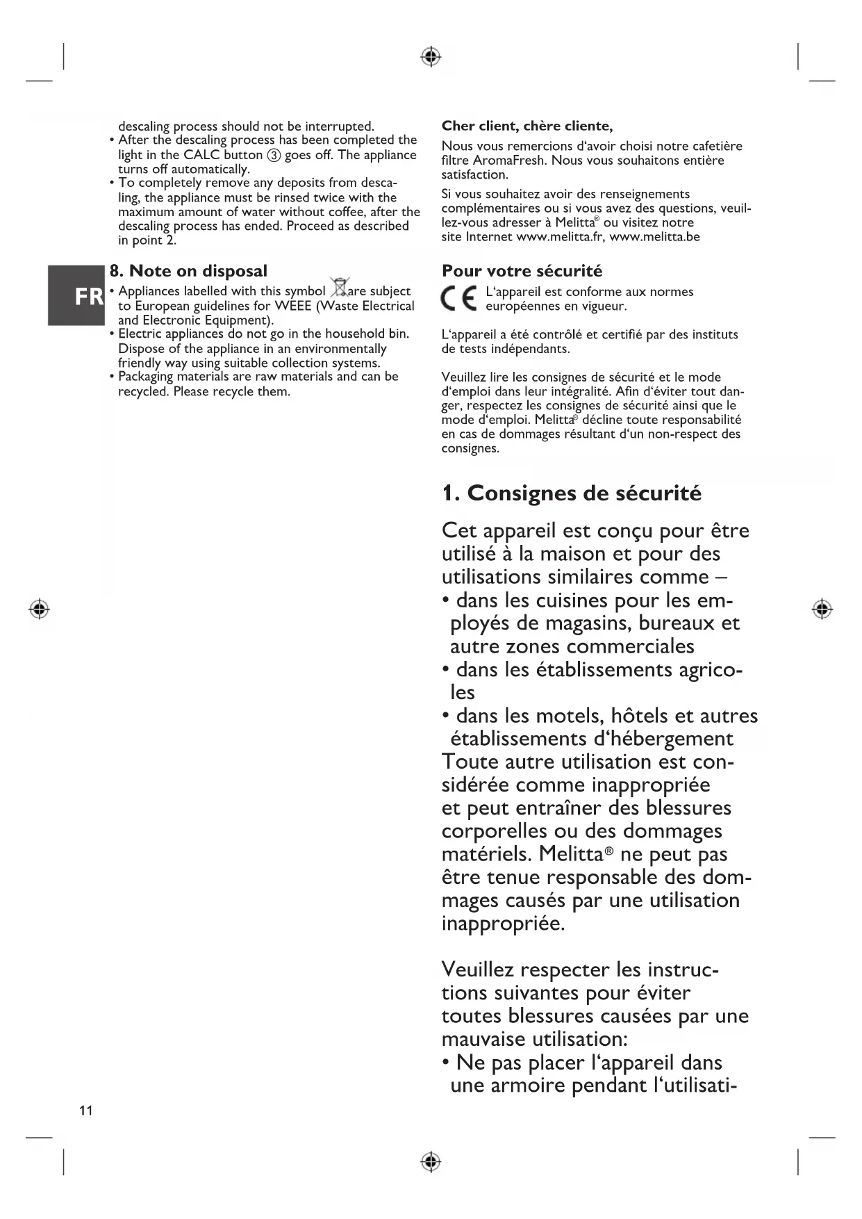 - Attention: Only by running the complete descaling process can all limescale deposits be removed. Only then does the Calc LED go o. Therefore the G B11 Cher client, chère cliente, Nous vous remercions d‘avoir choisi notre cafetière filtre AromaFresh. Nous vous souhaitons entière satisfaction. Si vous souhaitez avoir des renseignements complémentaires ou si vous avez des questions, veuil- lez-vous adresser à Melitta