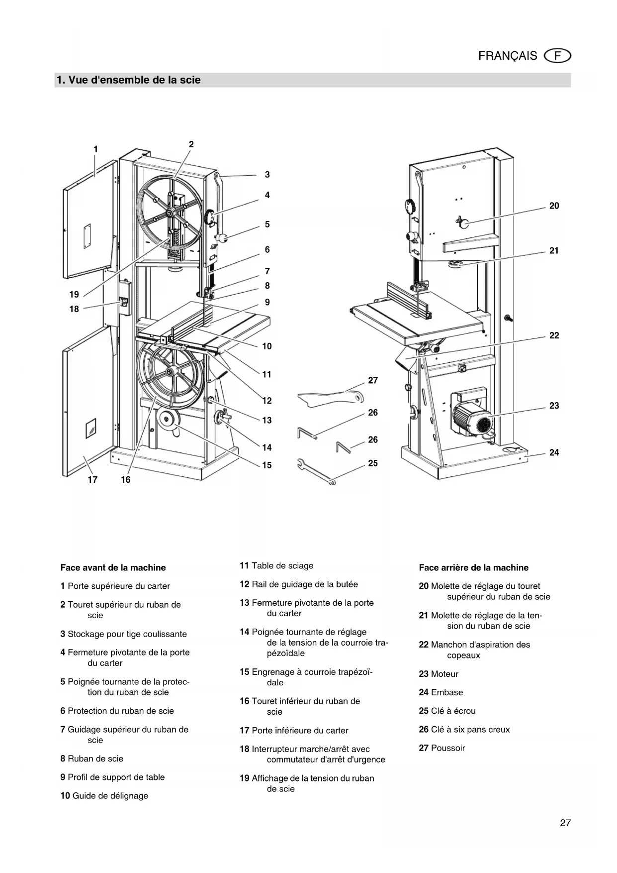 Face avant de la machine 1 Porte supérieure du carter 2 Touret supérieur du ruban de scie 3 Stockage pour tige coulissante 4 Fermeture pivotante de la porte du carter 5 Poignée tournante de la protec- tion du ruban de scie 6 Protection du ruban de scie 7 Guidage supérieur du ruban de scie 8 Ruban de scie 9 Profil de support de table 10 Guide de délignage 11 Table de sciage 12 Rail de guidage de la butée 13 Fermeture pivotante de la porte du carter 14 Poignée tournante de réglage de la tension de la courroie tra- pézoïdale 15 Engrenage à courroie trapézoï- dale 16 Touret inférieur du ruban de scie 17 Porte inférieure du carter 18 Interrupteur marche/arrêt avec commutateur d'arrêt d'urgence 19 Affichage de la tension du ruban de scie Face arrière de la machine 20 Molette de réglage du touret supérieur du ruban de scie 21 Molette de réglage de la ten- sion du ruban de scie 22 Manchon d'aspiration des copeaux 23 Moteur 24 Embase 25 Clé à écrou 26 Clé à six pans creux 27 Poussoir XA0046F6.fm Instructions d’utilisation originales DEUTSCH28 FRANÇAIS
