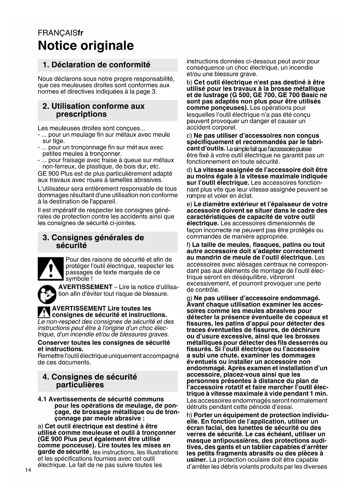 structions données ci-dessous peut avoir pour conséquence un choc électrique, un incendie et/ou une blessure grave. b) Ce t outil électrique n'est pas destiné à être utilisé pour les travaux à la brosse métallique et de lustrage (G 500, GE 700, GE 700 Basic ne sont pas adap tés non plus pour être utilisés comme ponçeuses). Les opérations pour lesquelles l’outil électrique n’a pas été conçu peuvent provoquer un danger et causer un accident corporel. c) Ne pas ut iliser d’accessoires non conçus spécifiquement et recommandés par le fabri- cant d’outils. L e simple fait que l’accessoire puisse être fixé à votre outil électrique ne garantit pas un fonctionnement en toute sécurité. d) La vitesse a ssignée de l’accessoire doit être au moins égale à la vitesse maximale indiquée sur l’outil électrique. Les accessoires fonction- nant plus vite que leur vitesse assignée peuvent se