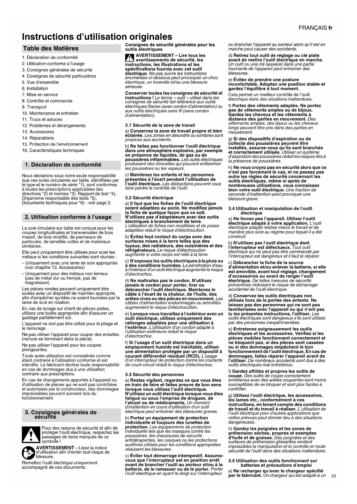Nous déclarons sous notre seule responsabilité que ces scies circulaires sur table, identifiées par le type et le numéro de série *1), sont conformes à toutes les prescriptions applicables des directives *2) et normes *3). Rapport de test *4), Organisme responsable des tests *5), Documents techniques pour *6) - voir page 3. La scie circulaire sur table est conçue pour les coupes longitudinales et transversales de bois massif, de bois stratifié, de panneaux de particules, de lamellés collés et de matériaux similaires. Elle peut uniquement être utilisée pour scier les métaux si les conditions suivantes sont réunies : – Uniquement avec une lame de scie appropriée (voir chapitre 13. Accessoires) – Uniquement pour des métaux non ferreux (pas de métal dur ou trempé, pas de magnésium) Les pièces rondes peuvent uniquement être sciées avec un dispositif de maintien approprié, afin d'empêcher qu'elles ne soient tournées par la lame de scie en rotation. En cas de sciage sur chant de pièces plates, utilisez une butée appropriée afin d'assurer un guidage parfaitement sûr. L'appareil ne doit pas être utilisé pour le pliage et le rainurage. Ne pas utiliser l'appareil pour couper des entailles (rainure se terminant dans la pièce). Ne pas utiliser l'appareil pour les coupes plongeantes. Toute autre utilisation est considérée comme étant contraire à l'utilisation conforme et est interdite. Le fabricant décline toute responsabilité en cas de dommages dus à une utilisation contraire aux prescriptions. En cas de changements apportés à l'appareil ou d'utilisation de pièces qui ne sont pas contrôlées et autorisées par le constructeur, des dommages imprévisibles peuvent survenir lors du fonctionnement. Pour des raisons de sécurité et afin de protéger l'outil électrique, respectez les passages de texte marqués de ce symbole ! AVERTISSEMENT – Lisez la notice d'utilisation afin d'éviter tout risque de blessure. Remettez l'outil électrique uniquement accompagné de ces documents. Consignes de sécurité générales pour les outils électriques AVERTISSEMENT – Lire tous les avertissements de sécurité, les instructions, les illustrations et les spécifications fournis avec cet outil électrique. Ne pas suivre les instructions énumérées ci-dessous peut provoquer un choc électrique, un incendie et/ou une blessure sérieuse. Conserver toutes les consignes de sécurité et instructions ! Le terme « outil » utilisé dans les consignes de sécurité fait référence aux outils électriques filaires (avec cordon d'alimentation) ou aux outils électriques sans fil (sans cordon d'alimentation).