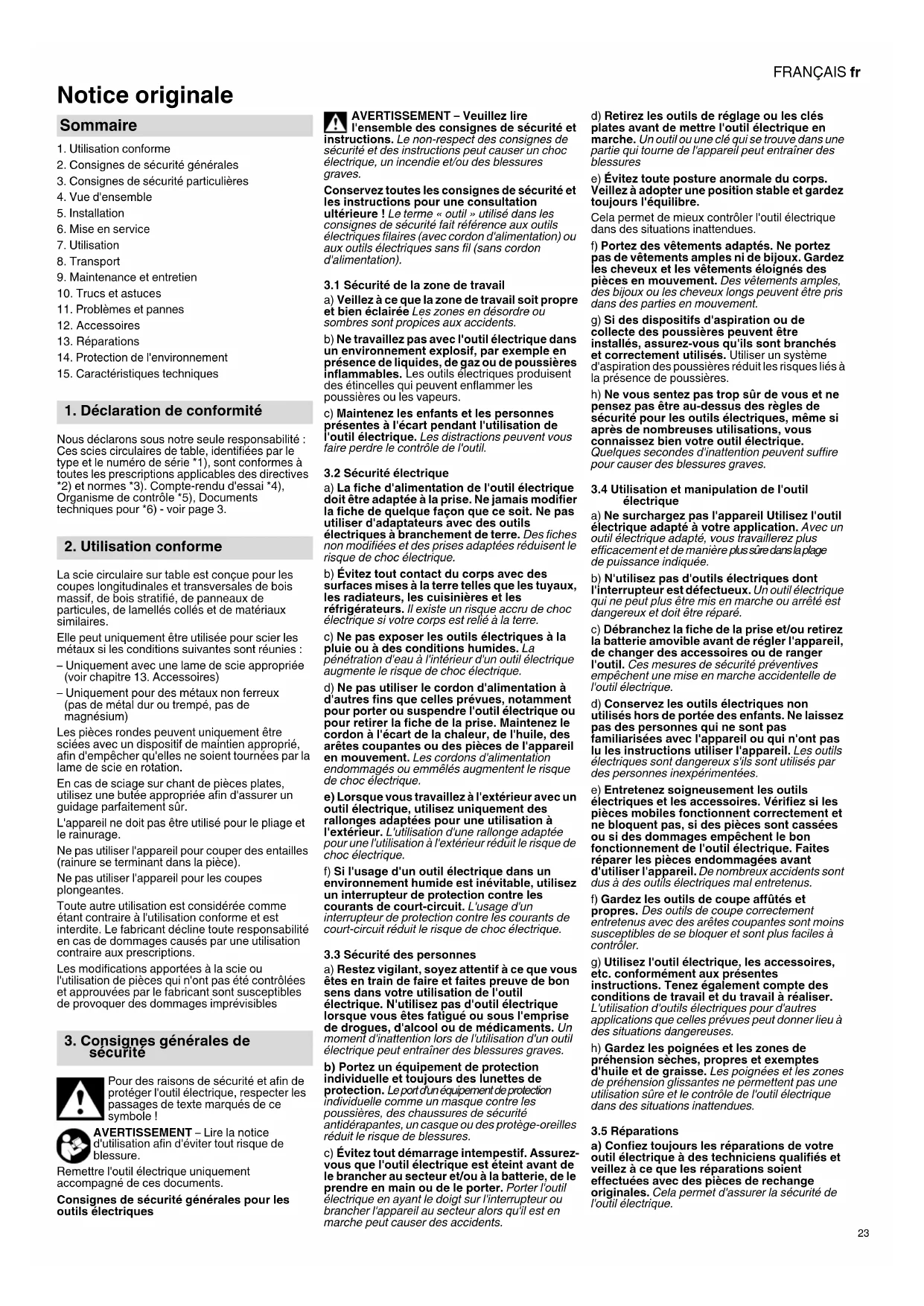 Nous déclarons sous notre seule responsabilité : Ces scies circulaires de table, identifiées par le type et le numéro de série *1), sont conformes à toutes les prescriptions applicables des directives *2) et normes *3). Compte-rendu d'essai *4), Organisme de contrôle *5), Documents techniques pour *6) - voir page 3. La scie circulaire sur table est conçue pour les coupes longitudinales et transversales de bois massif, de bois stratifié, de panneaux de particules, de lamellés collés et de matériaux similaires. Elle peut uniquement être utilisée pour scier les métaux si les conditions suivantes sont réunies : – Uniquement avec une lame de scie appropriée (voir chapitre 13. Accessoires) – Uniquement pour des métaux non ferreux (pas de métal dur ou trempé, pas de magnésium) Les pièces rondes peuvent uniquement être sciées avec un dispositif de maintien approprié, afin d'empêcher qu'elles ne soient tournées par la lame de scie en rotation. En cas de sciage sur chant de pièces plates, utilisez une butée appropriée afin d'assurer un guidage parfaitement sûr. L'appareil ne doit pas être utilisé pour le pliage et le rainurage. Ne pas utiliser l'appareil pour couper des entailles (rainure se terminant dans la pièce). Ne pas utiliser l'appareil pour les coupes plongeantes. Toute autre utilisation est considérée comme étant contraire à l'utilisation conforme et est interdite. Le fabricant décline toute responsabilité en cas de dommages causés par une utilisation contraire aux prescriptions. Les modifications apportées à la scie ou l'utilisation de pièces qui n'ont pas été contrôlées et approuvées par le fabricant sont susceptibles de provoquer des dommages imprévisibles Pour des raisons de sécurité et afin de protéger l'outil électrique, respecter les passages de texte marqués de ce symbole ! AVERTISSEMENT – Lire la notice d'utilisation afin d'éviter tout risque de blessure. Remettre l'outil électrique uniquement accompagné de ces documents. Consignes de sécurité générales pour les outils électriques AVERTISSEMENT – Veuillez lire l'ensemble des consignes de sécurité et instructions. Le non-respect des consignes de sécurité et des instructions peut causer un choc électrique, un incendie et/ou des blessures graves. Conservez toutes les consignes de sécurité et les instructions pour une consultation ultérieure ! Le terme « outil » utilisé dans les consignes de sécurité fait référence aux outils électriques filaires (avec cordon d'alimentation) ou aux outils électriques sans fil (sans cordon d'alimentation).