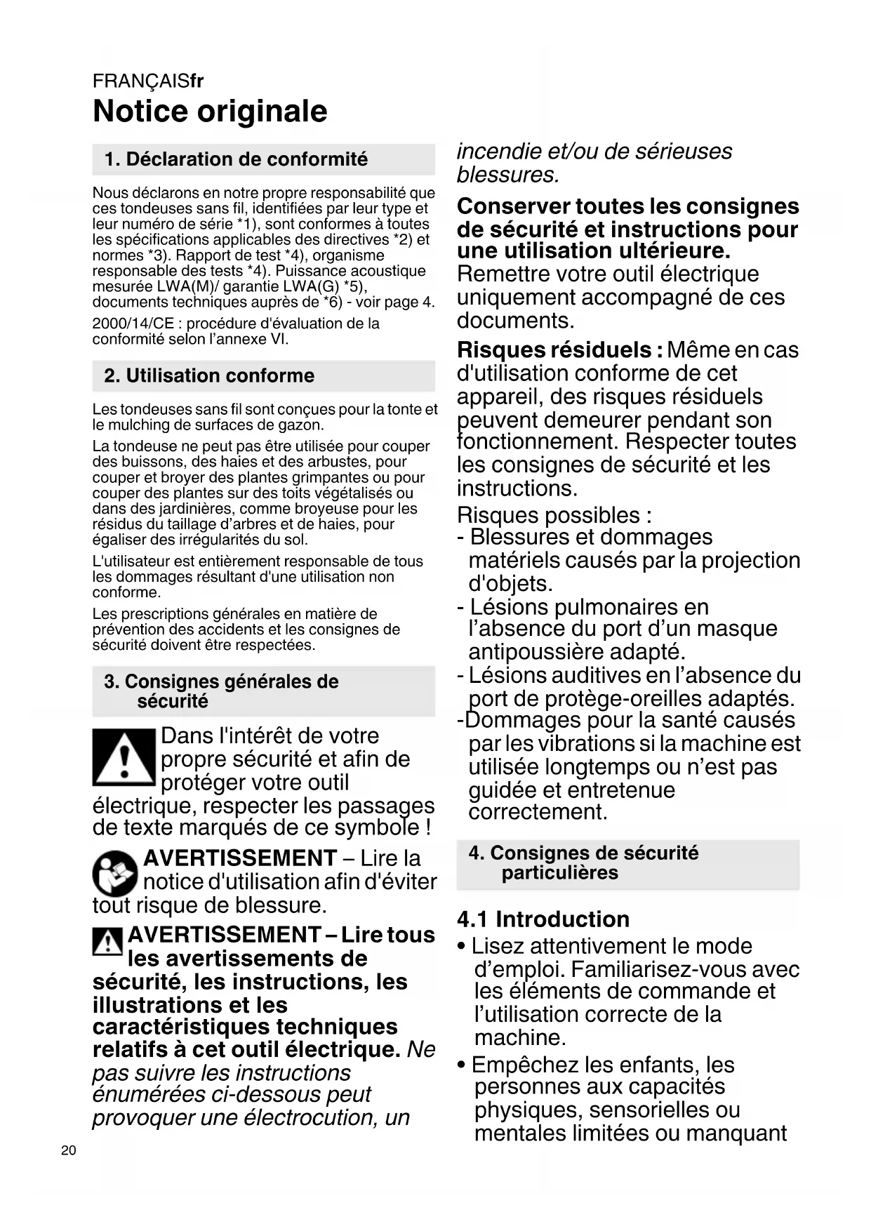 Notice originale Nous déclarons en notre propre responsabilité que ces tondeuses sans fil, identifiées par leur type et leur numéro de série *1), sont conformes à toutes les spécifications applicables des directives *2) et normes *3). Rapport de test *4), organisme responsable des tests *4). Puissance acoustique mesurée LWA(M)/ garantie LWA(G) *5), documents techniques auprès de *6) - voir page 4. 2000/14/CE : procédure d'évaluation de la conformité selon l’annexe VI. Les tondeuses sans fil sont conçues pour la tonte et le mulching de surfaces de gazon. La tondeuse ne peut pas être utilisée pour couper des buissons, des haies et des arbustes, pour couper et broyer des plantes grimpantes ou pour couper des plantes sur des toits végétalisés ou dans des jardinières, comme broyeuse pour les résidus du taillage d’arbres et de haies, pour égaliser des irrégularités du sol. L'utilisateur est entièrement responsable de tous les dommages résultant d'une utilisation non conforme. Les prescriptions générales en matière de prévention des accidents et les consignes de sécurité doivent être respectées. Dans l'intérêt de votre propre sécurité et afin de protéger votre outil électrique, respecter les passages de texte marqués de ce symbole ! AVERTISSEMENT – Lire la notice d'utilisation afin d'éviter tout risque de blessure. AVERTISSEMENT – Lire tous les avertissements de sécurité, les instructions, les illustrations et les caractéristiques techniques relatifs à cet outil électrique. Ne pas suivre les instructions énumérées ci-dessous peut provoquer une électrocution, un incendie et/ou de sérieuses blessures. Conserver toutes les consignes de sécurité et instructions pour une utilisation ultérieure. Remettre votre outil électrique uniquement accompagné de ces documents. Risques résiduels : Même en cas d'utilisation conforme de cet appareil, des risques résiduels peuvent demeurer pendant son fonctionnement. Respecter toutes les consignes de sécurité et les instructions. Risques possibles : - Blessures et dommages matériels causés par la projection d'objets. - Lésions pulmonaires en l’absence du port d’un masque antipoussière adapté. - Lésions auditives en l’absence du port de protège-oreilles adaptés. -Dommages pour la santé causés par les vibrations si la machine est utilisée longtemps ou n’est pas guidée et entretenue correctement.