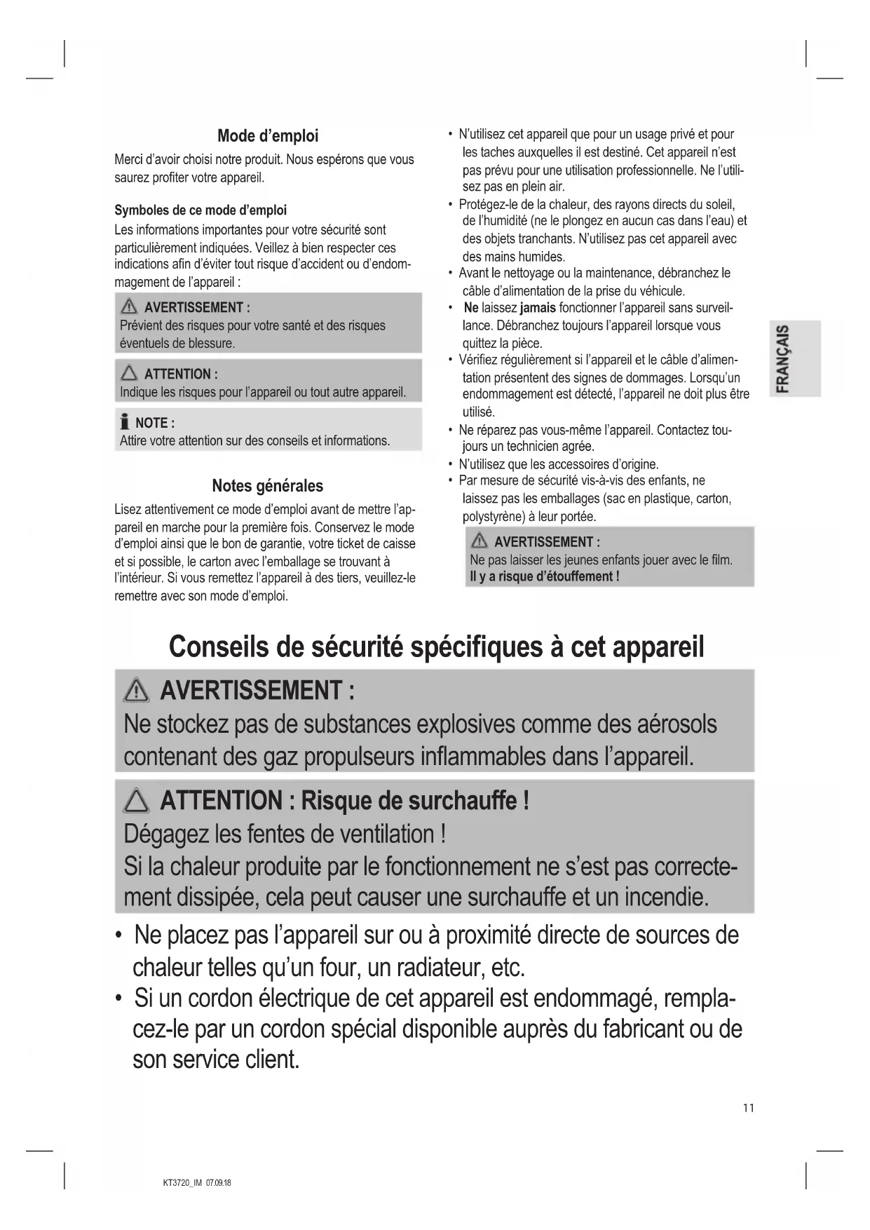 - Si un cordon électrique de cet appareil est endommagé, rempla- cez-le par un cordon spécial disponible auprès du fabricant ou de son service client.KT3720_IM 07.09.18