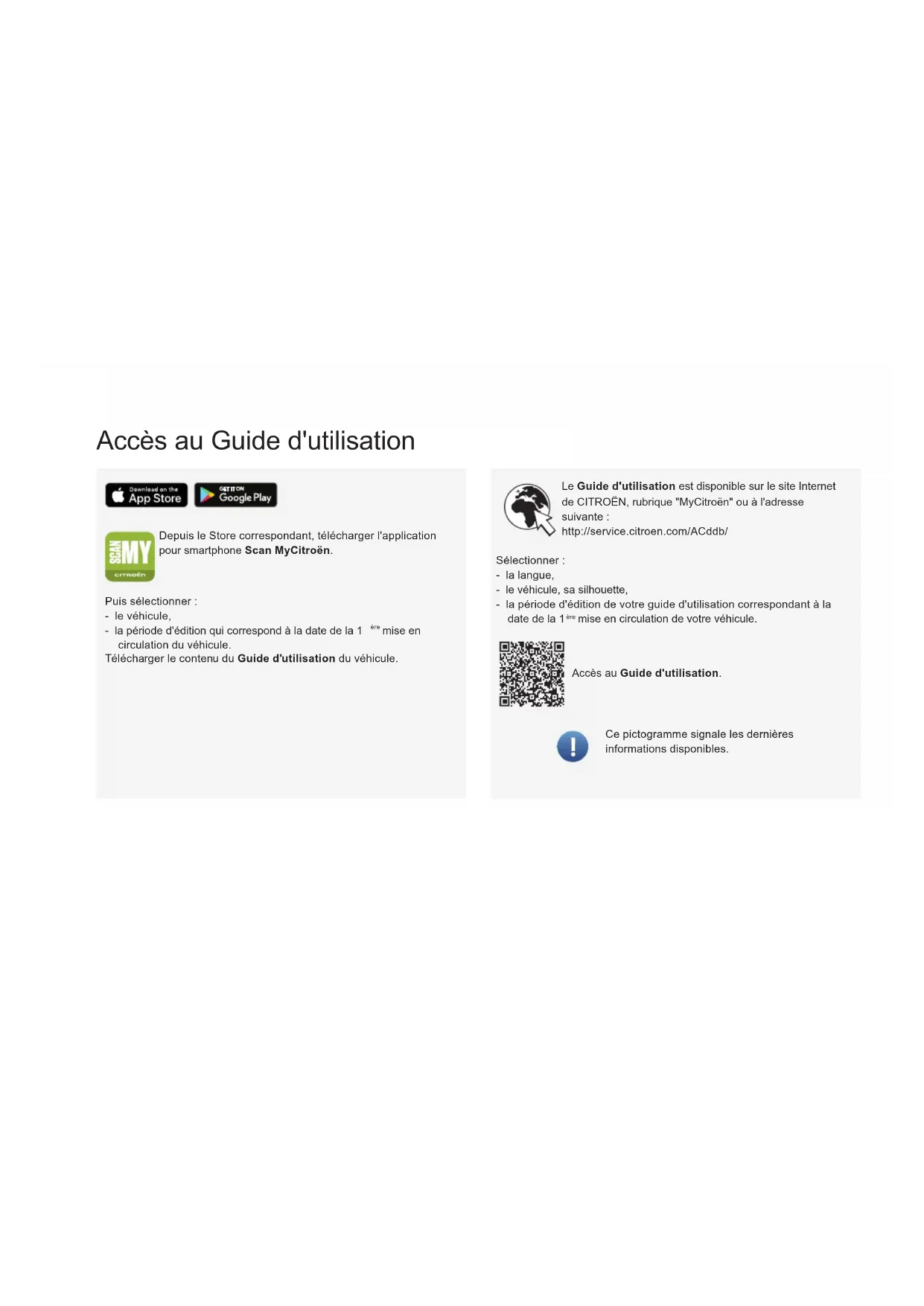 GUIDE D'UTILISATIONAccès au Guide d'utilisation Le Guide d'utilisation est disponible sur le site Internet de CITROËN, rubrique "MyCitroën" ou à l'adresse suivante : http://service.citroen.com/ACddb/ Accès au Guide d'utilisation. Sélectionner : - la langue, - le véhicule, sa silhouette, - la période d'édition de votre guide d'utilisation correspondant à la date de la 1 ère mise en circulation de votre véhicule. Puis sélectionner : - le véhicule, - la période d'édition qui correspond à la date de la 1 ère mise en circulation du véhicule. Télécharger le contenu du Guide d'utilisation du véhicule. Depuis le Store correspondant, télécharger l'application pour smartphone Scan MyCitroën. Ce pictogramme signale les dernières informations disponibles.1 Bienvenue Nous vous remercions d'avoir choisi un Citroën C5 AIRCROSS. Votre véhicule reprend une partie des équipements décrits dans ce document, en fonction du niveau de finition, de la version et des caractéristiques propres au pays de commercialisation. Les descriptions et figures sont données sans engagement. Automobiles CITROËN se réserve le droit de modifier les caractéristiques techniques, équipements et accessoires sans être tenue de mettre à jour le présent guide. En cas de cession de votre véhicule, penser à remettre ce Guide d'utilisation au nouveau propriétaire. L'ensemble des instructions et recommandations de fonctionnement y sont présentées pour profiter au mieux du véhicule. Il est fortement recommandé d'en prendre connaissance ainsi que du carnet d'entretien et de garanties renseignant sur les garanties, l'entretien et l'assistance routière associés au véhicule. Légende Avertissement pour la sécurité Information complémentaire Contribution à la protection de la nature Véhicule avec poste de conduite à gauche Véhicule avec poste de conduite à droite Localisation par une zone noire de l'équipement / du bouton décrit2