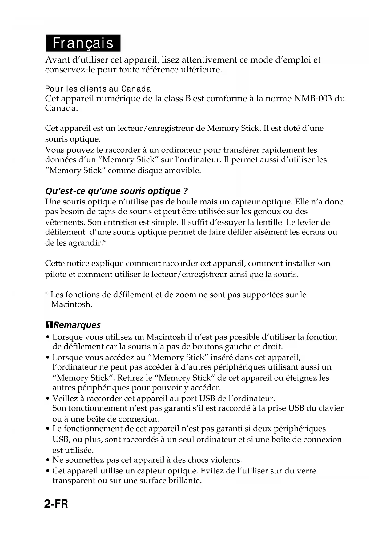 - Un “Memory Stick” formaté sur un Macintosh peut être utilisable sur un périphérique compatible avec le “Memory Stick”. Ne pas formater de “Memory Stick” sur un Macintosh.5-FR Table des matières Informations préliminaires Vérification des accessoires ................................................................................. 6 Identification des éléments ................................................................................. 7 Installation Windows Installation du pilote USB ............................................................................ 8 Installation du pilote de la souris ............................................................. 10 Installation du pilote de “Memory Stick” ............................................... 12 Macintosh Installation du pilote USB .......................................................................... 13 Fonctionnement Utilisation du lecteur/enregistreur Windows ...................................................................................................... 14 Macintosh ..................................................................................................... 15 Pour les utilisateur des HandyCam et Cyber-shot numériques SONY ..... 16 Utilisation de la souris ....................................................................................... 17 Informations supplémentaires En cas de problème ............................................................................................ 19 Spécifications ....................................................................................................... 21 Raccordements conseillés .................................................................................. 226-FR BInformations préliminaires Vérification des accessoires Assurez-vous d’être en possession de tous les accessoires indiqués ci- dessous. Si certains manquent, contactez votre revendeur ou un service après-vente agréé Sony.