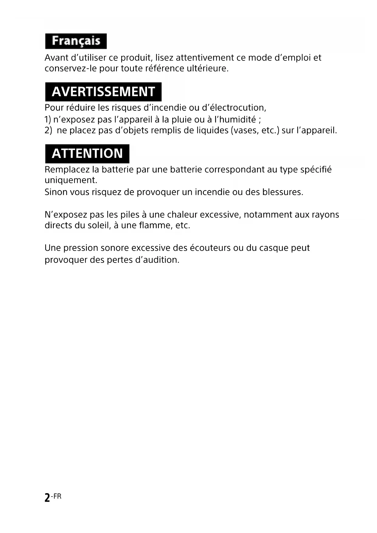 ATTENTION Remplacez la batterie par une batterie correspondant au type spécifié uniquement. Sinon vous risquez de provoquer un incendie ou des blessures. N’exposez pas les piles à une chaleur excessive, notamment aux rayons directs du soleil, à une flamme, etc. Une pression sonore excessive des écouteurs ou du casque peut provoquer des pertes d’audition.3 -FR CONSIGNES DE