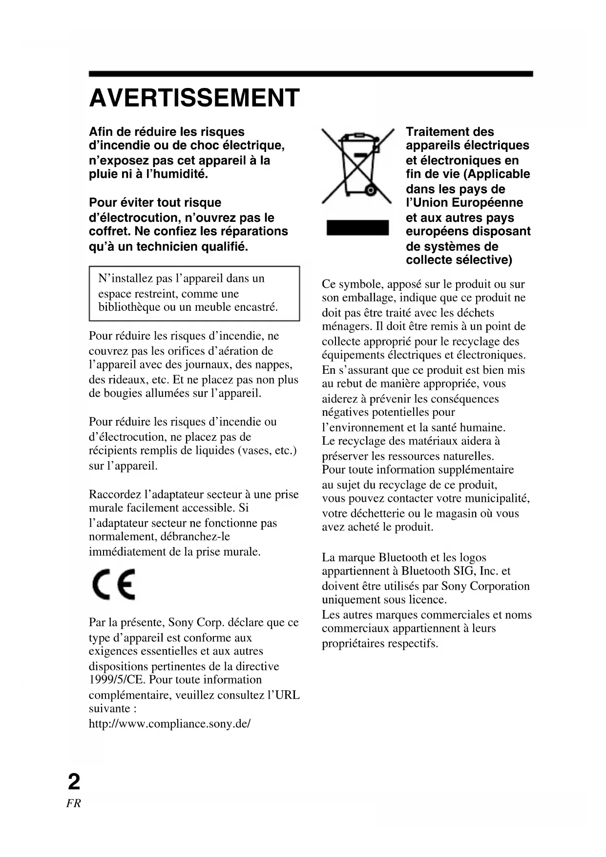 AVERTISSEMENT Afin de réduire les risques d’incendie ou de choc électrique, n’exposez pas cet appareil à la pluie ni à l’humidité. Pour éviter tout risque d’électrocution, n’ouvrez pas le coffret. Ne confiez les réparations qu’à un technicien qualifié. N’installez pas l’appareil dans un espace restreint, comme une bibliothèque ou un meuble encastré. Pour réduire les risques d’incendie, ne couvrez pas les orifices d’aération de l’appareil avec des journaux, des nappes, des rideaux, etc. Et ne placez pas non plus de bougies allumées sur l’appareil. Pour réduire les risques d’incendie ou d’électrocution, ne placez pas de récipients remplis de liquides (vases, etc.) sur l’appareil. Raccordez l’adaptateur secteur à une prise murale facilement accessible. Si l’adaptateur secteur ne fonctionne pas normalement, débranchez-le immédiatement de la prise murale. Par la présente, Sony Corp. déclare que ce type d’appareil est conforme aux exigences essentielles et aux autres dispositions pertinentes de la directive 1999/5/CE. Pour toute information complémentaire, veuillez consultez l’URL suivante : http://www.compliance.sony.de/ La marque Bluetooth et les logos appartiennent à Bluetooth SIG, Inc. et doivent être utilisés par Sony Corporation uniquement sous licence. Les autres marques commerciales et noms commerciaux appartiennent à leurs propriétaires respectifs. Traitement des appareils électriques et électroniques en fin de vie (Applicable dans les pays de l’Union Européenne et aux autres pays européens disposant de systèmes de collecte sélective) Ce symbole, apposé sur le produit ou sur son emballage, indique que ce produit ne doit pas être traité avec les déchets ménagers. Il doit être remis à un point de collecte approprié pour le recyclage des équipements électriques et électroniques. En s’assurant que ce produit est bien mis au rebut de manière appropriée, vous aiderez à prévenir les conséquences négatives potentielles pour l’environnement et la santé humaine. Le recyclage des matériaux aidera à préserver les ressources naturelles. Pour toute information supplémentaire au sujet du recyclage de ce produit, vous pouvez contacter votre municipalité, votre déchetterie ou le magasin où vous avez acheté le produit.3