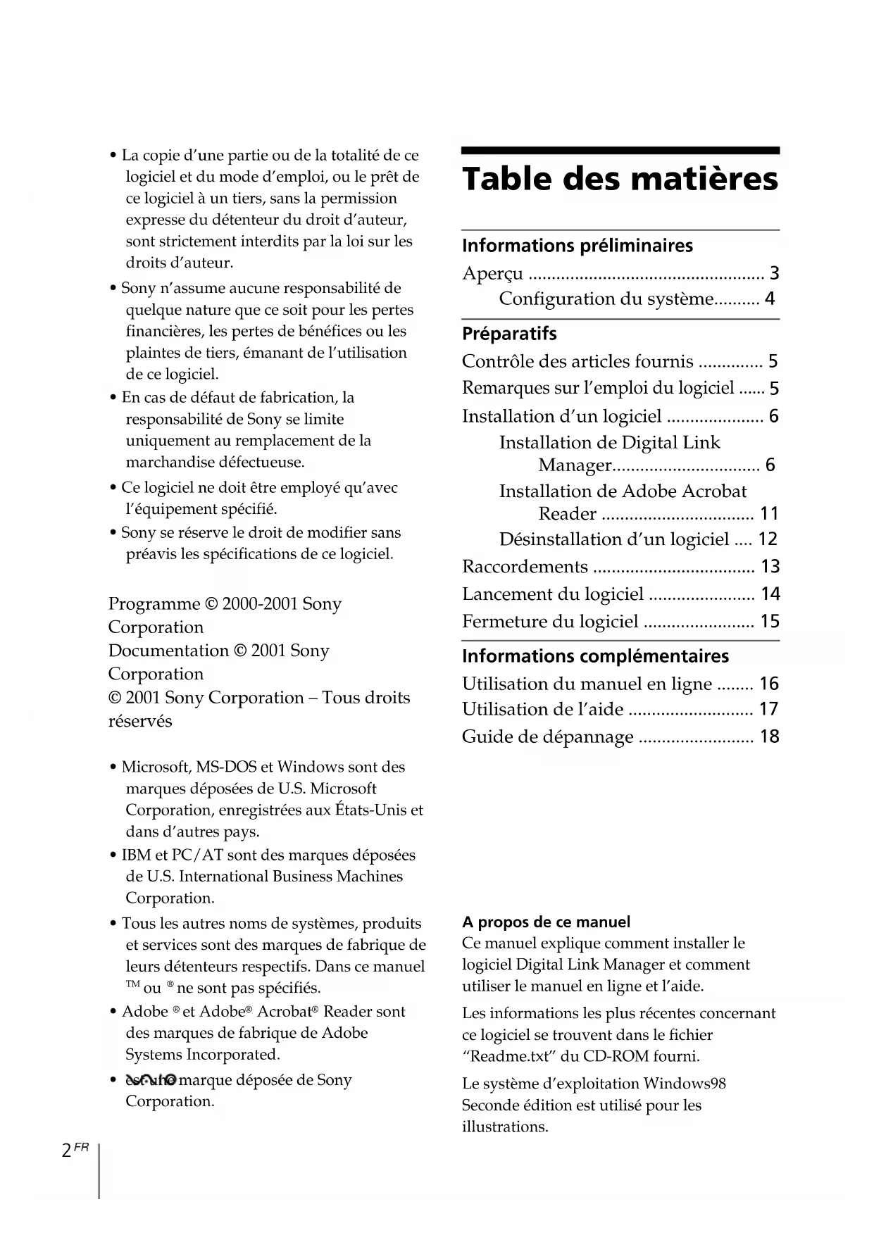 - Guide de dépannage A propos de ce manuel Ce manuel explique comment installer le logiciel Digital Link Manager et comment utiliser le manuel en ligne et l’aide. Les informations les plus récentes concernant ce logiciel se trouvent dans le fichier “Readme.txt” du CD-ROM fourni. Le système d’exploitation Windows98 Seconde édition est utilisé pour les illustrations.3 p. 18