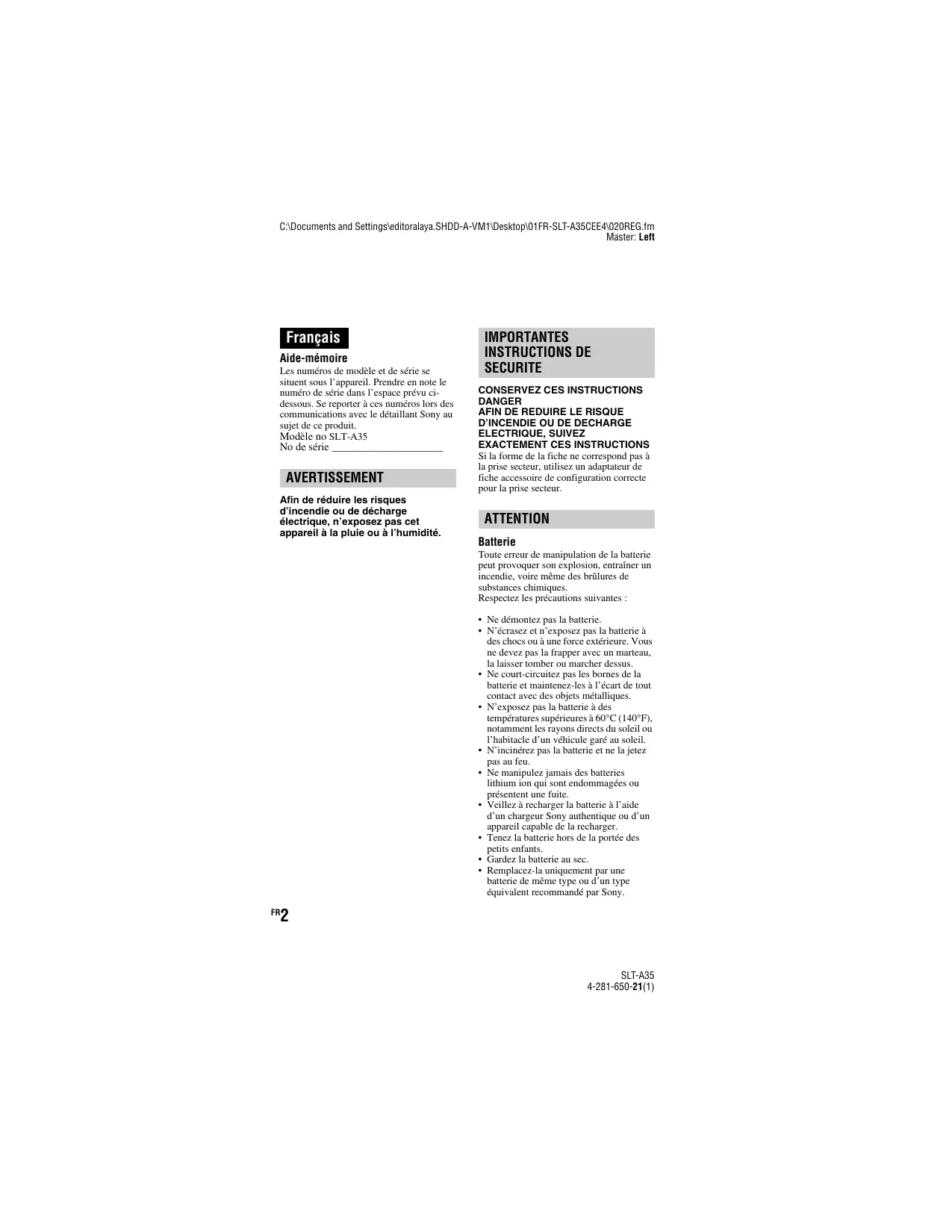 C:\Documents and Settings\editoralaya.SHDD-A-VM1\Desktop\01FR-SLT-A35CEE4\020REG.fm Master: Left Français Aide-mémoire Les numéros de modèle et de série se situent sous l’appareil. Prendre en note le numéro de série dans l’espace prévu cidessous. Se reporter à ces numéros lors des communications avec le détaillant Sony au sujet de ce produit. Modèle no SLT-A35 No de série ______________________ AVERTISSEMENT Afin de réduire les risques d’incendie ou de décharge électrique, n’exposez pas cet appareil à la pluie ou à l’humidité. IMPORTANTES INSTRUCTIONS DE SECURITE