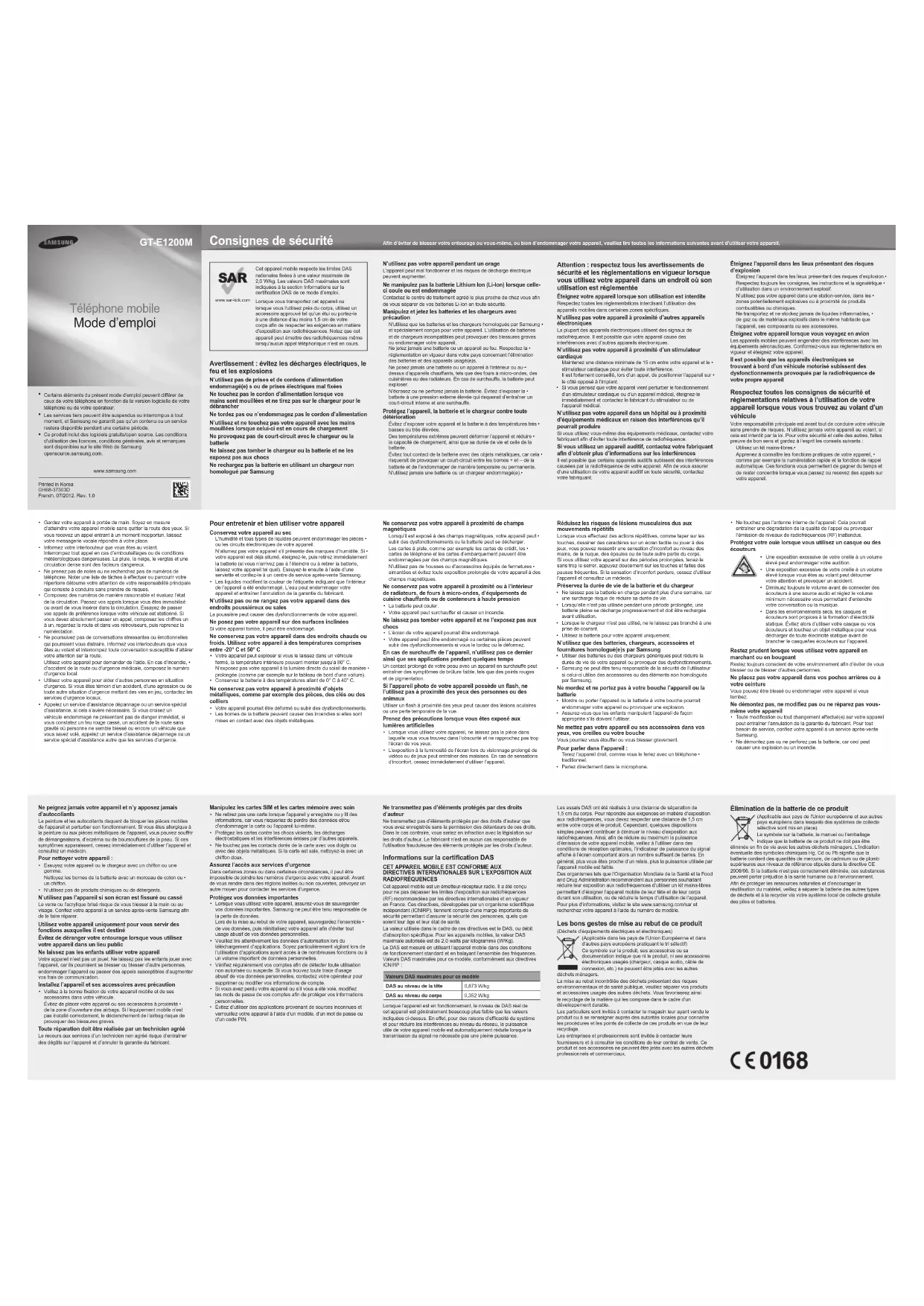 Activer la lampe torche Vous pouvez améliorer votre vision dans les endroits sombres en utilisant la fonction de lampe torche qui rend l’écran et le rétroéclairage de l’écran de votre téléphone aussi lumineux que possible. En mode veille, maintenez la touche de navigation Haut enfoncée pour activer le mode lampe torche. La torche s’allume automatiquement. Pour éteindre la lampe torche, appuyez sur <Désactivée>. Pour désactiver le mode lampe torche, appuyez sur <Retour>. Insérer la carte SIM et la batterie Retirez le cache de la batterie et la batterie, puis 1. insérez la carte SIM. Mettez la batterie en place, puis replacez le cache.2. Batterie Déclaration de conformité (R&TTE) Nous, Samsung Electronicsdéclarons sous notre seule responsabilité que le produit Téléphone portable GSM : GT-E1200M en relation avec cette déclaration est en conformité avec les normes suivantes et/ou d’autres documents normatifs.Sécurité EN 60950-1 : 2006 + A1 : 2010DAS EN 50360 : 2001 / AC 2006 EN 62209-1 : 2006 EN 62209-2 : 2010 EN 62311 : 2008CEM EN 301 489-01 V1.8.1 (04-2008) EN 301 489-07 V1.3.1 (11-2005)Radio EN 301 511 V9.0.2 (03-2003)Ce produit a été testé et s’est avéré conforme aux normes relatives à l’émission de fréquences radio. En outre, nous déclarons que cet appareil satisfait à toutes les conditions essentielles de la directive 1999/5/CE. La procédure de déclaration de conformité, définie dans l’article 10, puis reprise à l’alinéa [IV] de la directive 1999/5/EC a été conduite sous contrôle de l’organisme suivant :BABT, Forsyth House, Churchfield Road, Walton-on-Thames, Surrey, KT12 2TD, UK* Numéro d’identification : 0168Documentation technique détenue par :Samsung Electronics QA Lab.disponible sur simple demande. (Représentant pour l’union européenne) Samsung Electronics Euro QA Lab. Blackbushe Business Park, Saxony Way, Yateley, Hampshire, GU46 6GG, Royaume-Uni*2012.02.23 Joong-Hoon Choi / Directeur de laboratoire(lieu et date de parution) (nom et signature du responsable dûment habilité)