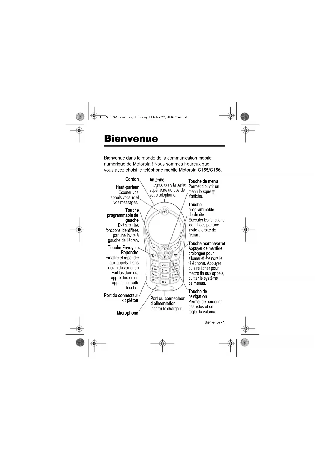 Bienvenue - 1 Bienvenue Bienvenue dans le monde de la communication mobile numérique de Motorola ! Nous sommes heureux que vous ayez choisi le téléphone mobile Motorola C155/C156. Touche marche/arrêt Appuyer de manière prolongée pour allumer et éteindre le téléphone. Appuyer puis relâcher pour mettre fin aux appels, quitter le système de menus. Touche programmable de gauche Exécuter les fonctions identifiées par une invite à gauche de l’écran. Antenne Intégrée dans la partie supérieure au dos de votre téléphone. Touche de navigation Permet de parcourir des listes et de régler le volume. Touche Envoyer / Répondre Émettre et répondre aux appels. Dans l’écran de veille, on voit les derniers appels lorsqu’on appuie sur cette touche. Touche de menu Permet d’ouvrir un menu lorsque s’affiche. Port du connecteur d’alimentation Insérer le chargeur. Microphone Touche programmable de droite Exécuter les fonctions identifiées par une invite à droite de l’écran. Port du connecteur kit piéton Haut-parleur Écouter vos appels vocaux et vos messages. Cordon CFJN1109A.book Page 1 Friday, October 29, 2004 2:42 PM2 - Bienvenue Remarque : Votre téléphone peut légèrement varier par rapport au modèle illustré ci-dessus, toutefois l’emplacement des touches, les séquences et les fonctions restent les mêmes. Motorola, Inc. Consumer Advocacy Office 1307 East Algonquin Road Schaumburg, IL 60196 886-2-2705-1811 (TW) 1-800-331-6456 (États-Unis) 1-888-390-6456 (TTY/TDD États-Unis) 1-800-461-4575 (Canada) www.motorola.com.tw (TW) www.motorola.com (États-Unis) www.motorola.ca (Canada) MOTOROLA et le logo M stylisé sont des marques déposées au Bureau américain des marques et brevets. Les autres noms de produits et de services appartiennent à leurs propriétaires respectifs. © Motorola, Inc. 2004. Attention : Les modifications apportées au téléphone qui n’ont pas été expressément approuvées par Motorola annulent les capacités d’utilisation de l’appareil par l’utilisateur. CFJN1109A.book Page 2 Friday, October 29, 2004 2:42 PMBienvenue - 3 Notice concernant les droits d’auteur couvrant les logiciels Les produits Motorola décrits dans le présent manuel peuvent contenir certains logiciels, enregistrés dans des mémoires électroniques ou sur d’autres supports, qui sont couverts par des droits d’auteur en faveur de Motorola ou de ses fournisseurs. Les lois des États-Unis et d’autres pays garantissent certains droits à l’égard de ces logiciels à Motorola et à ses fournisseurs et leur réservent notamment les droits exclusifs de distribution et de reproduction. En vertu de ce qui précède et dans toute la mesure autorisée par la loi, les logiciels couverts par des droits d’auteur et contenus dans les produits Motorola ne peuvent être modifiés, soumis à ingénierie inverse, distribués ni reproduits sous aucune forme. Par ailleurs, l’acquisition de produits Motorola ne saurait accorder ni directement ni par implication, préclusion ou de quelque autre manière, de licence ou de droits sous couvert de droits d’auteur, de brevets ou d’applications brevetées de Motorola ou de l’un de ses fournisseurs, hormis la licence normale et non exclusive d’utiliser le produit Motorola gratuitement qui découle légalement de la vente dudit produit. CFJN1109A.book Page 3 Friday, October 29, 2004 2:42 PM4 - Bienvenue CFJN1109A.book Page 4 Friday, October 29, 2004 2:42 PMSommaire - 5 Sommaire Sécurité et Informations générales
