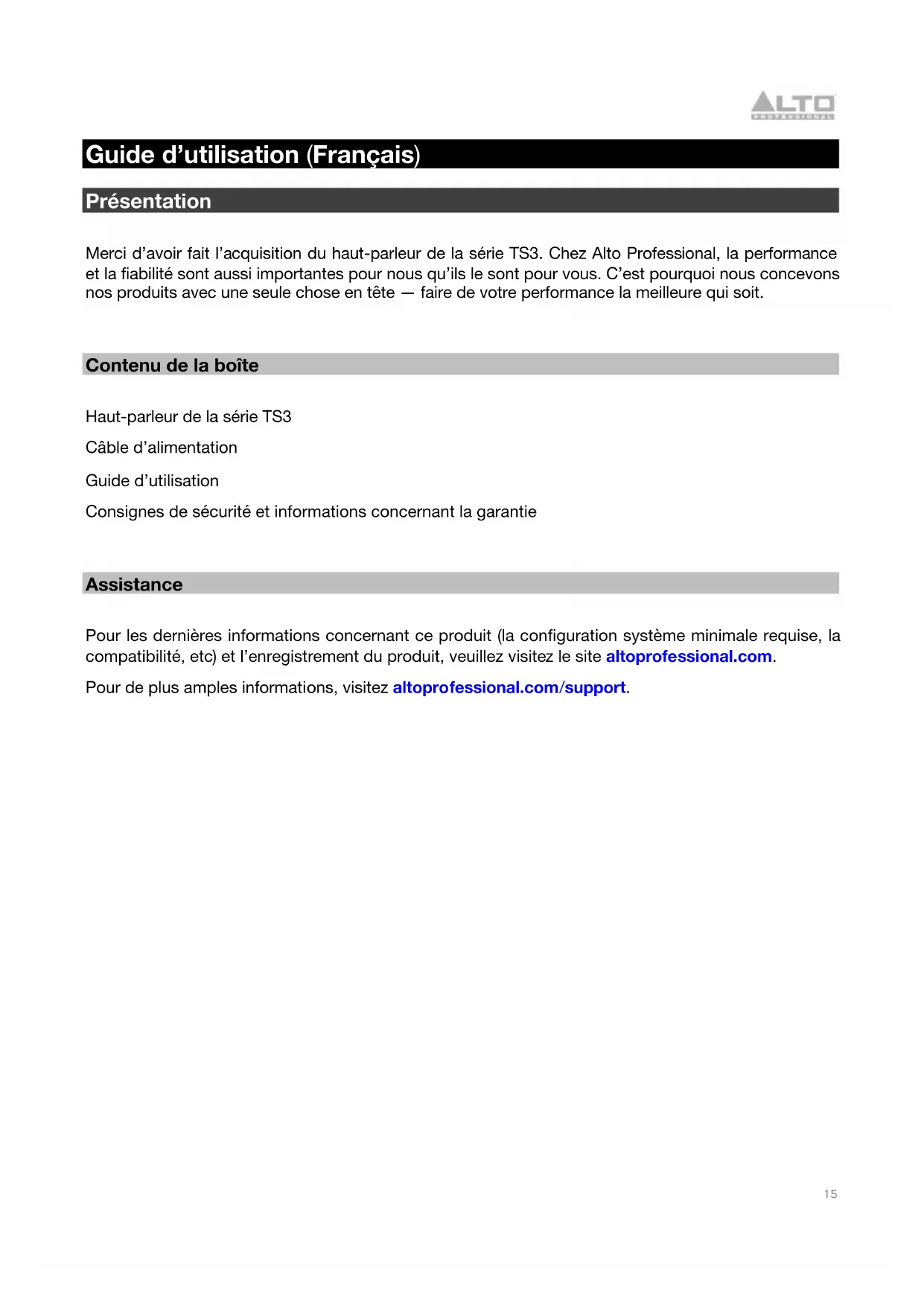 Guide d’utilisation (Français) Présentation Merci d’avoir fait l’acquisition du haut-parleur de la série TS3. Chez Alto Professional, la performance et la fiabilité sont aussi importantes pour nous qu’ils le sont pour vous. C’est pourquoi nous concevons nos produits avec une seule chose en tête — faire de votre performance la meilleure qui soit.