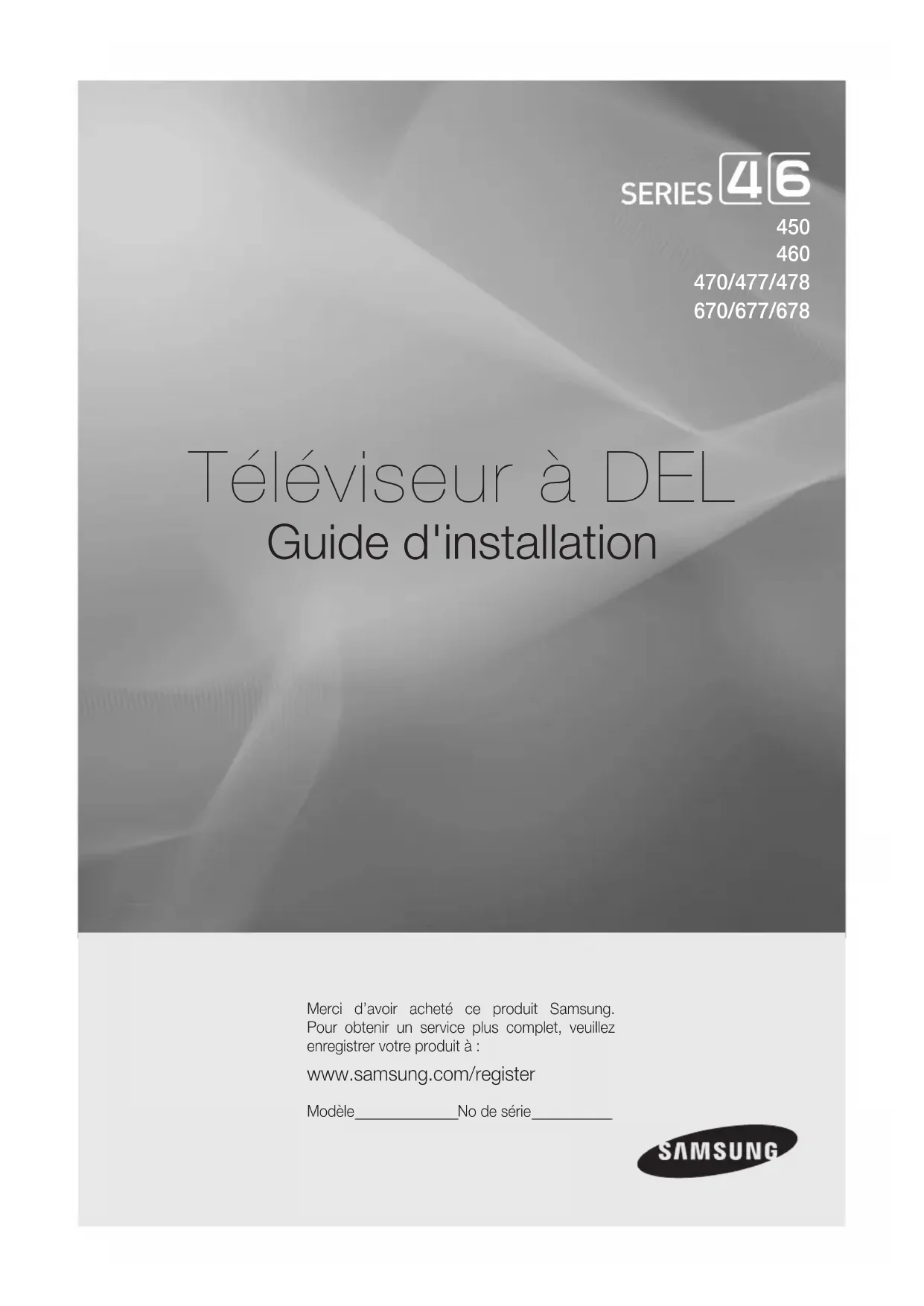 Téléviseur à DEL Guide d'installation Merci d’avoir acheté ce produit Samsung. Pour obtenir un service plus complet, veuillez enregistrer votre produit à: www.samsung.com/register Modèle No de série