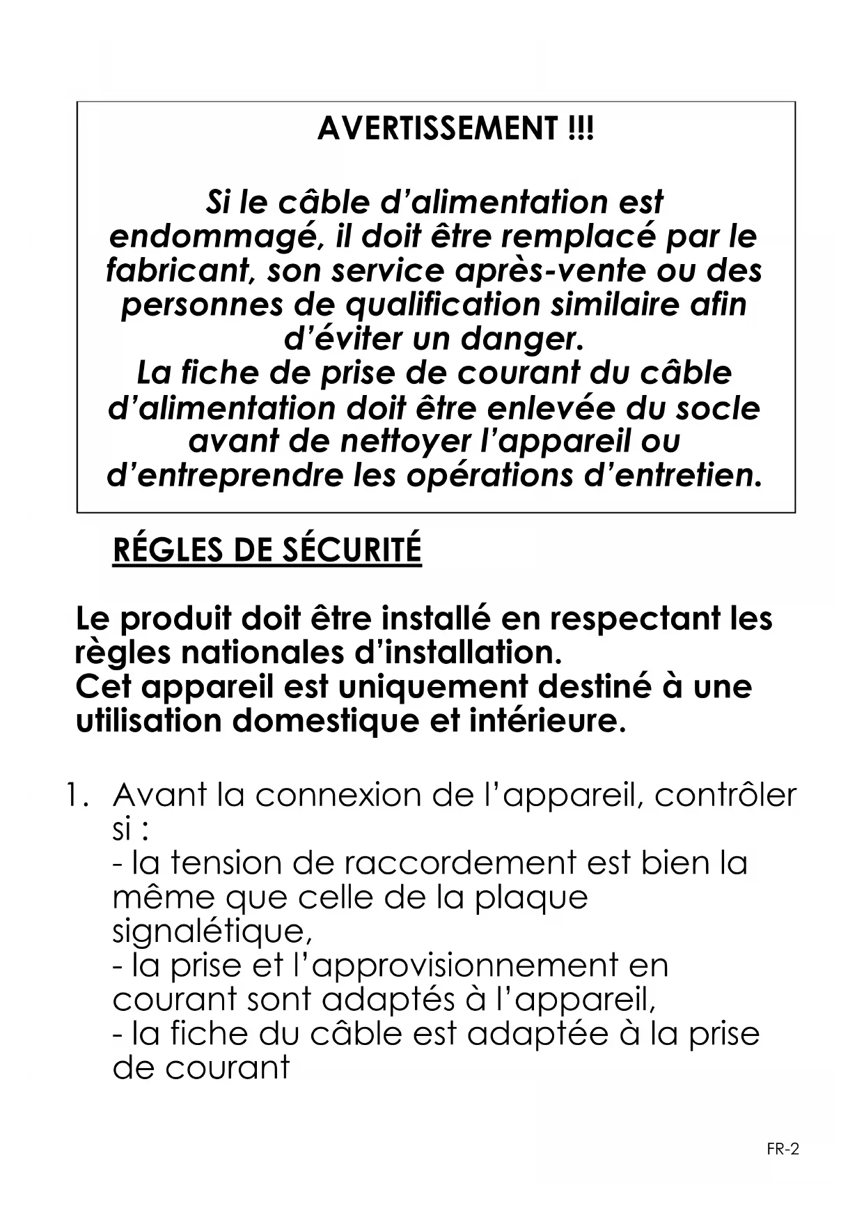 AVERTISSEMENT !!! Si le câble d’alimentation est endommagé, il doit être remplacé par le fabricant, son service après-vente ou des personnes de qualification similaire afin d’éviter un danger. La fiche de prise de courant du câble d’alimentation doit être enlevée du socle avant de nettoyer l’appareil ou d’entreprendre les opérations d’entretien.