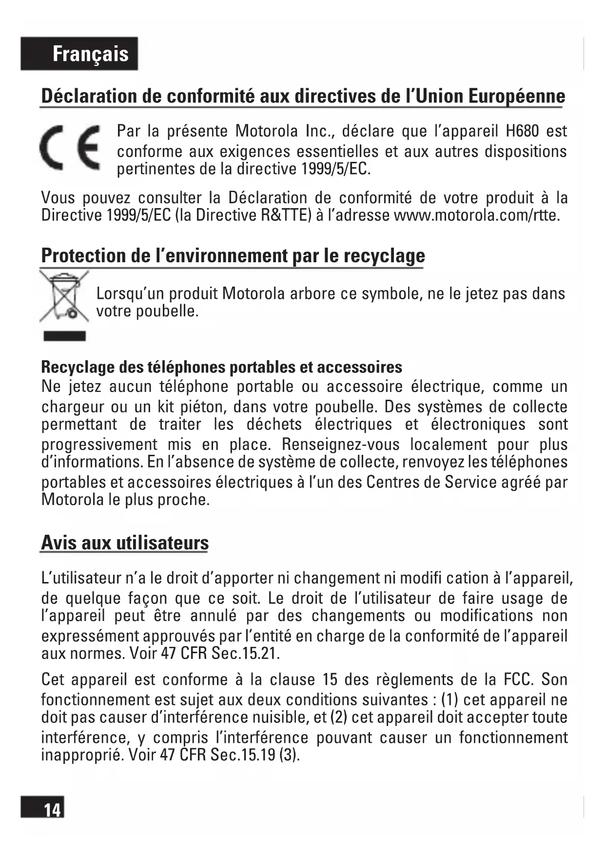 Retrouvez gratuitement la notice de l'appareil H680 MOTOROLA au format PDF.