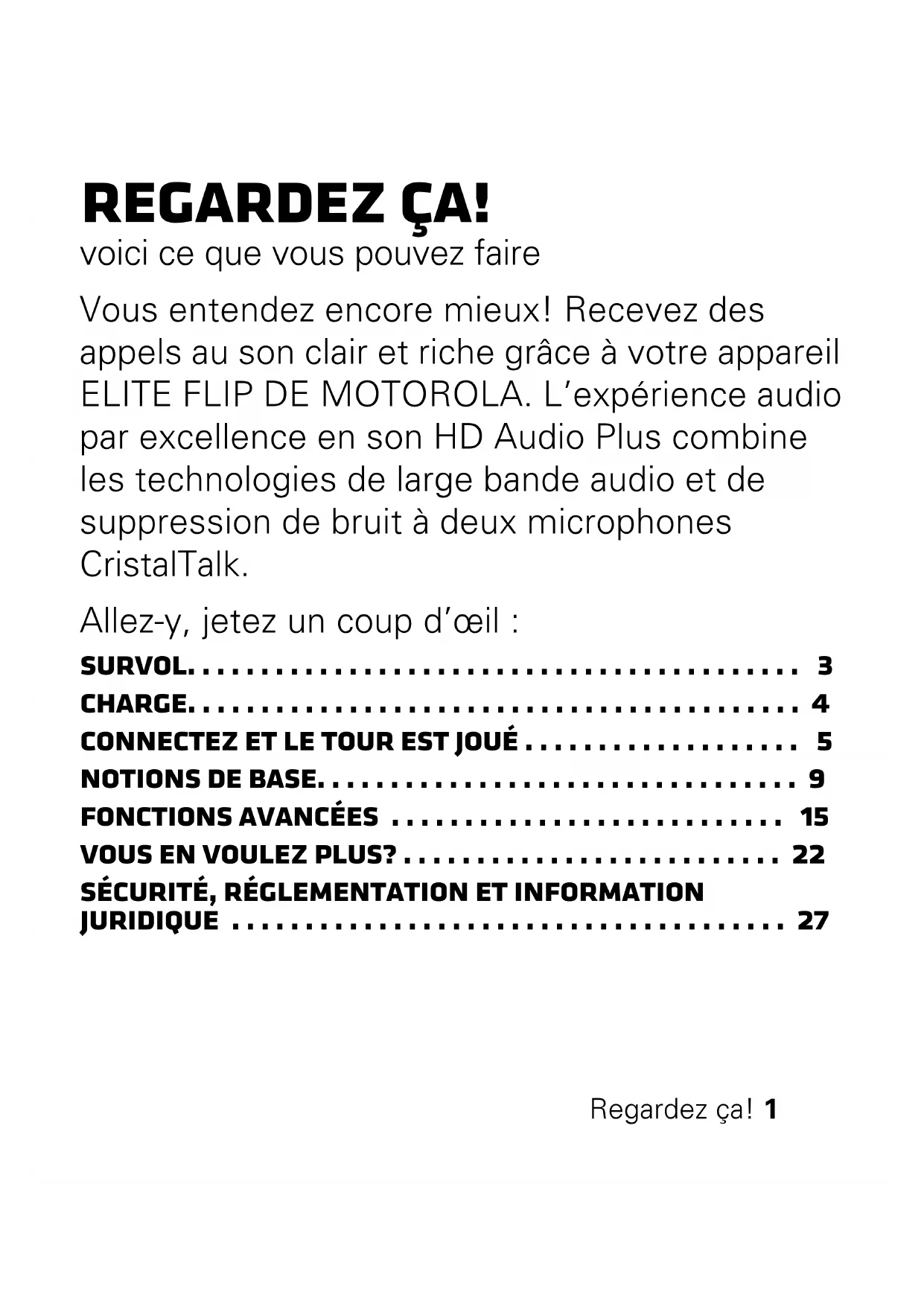 - Sécurité, réglementation et information juridique Regardez ça! Autres Renseignements Sur le Web : www.motorola.com/support. Mise en garde : veuillez lire les renseignements importants relatifs à la sécurité, à la réglementation et à l’information juridique à la fin du présent guide.Survol 3 Survol les principaux éléments, rapide et facile Touche intelligente Crochet d’oreille Connecteur de charge micro-USB (sur le côté) Microphone Touche de volume (sur le côté) Écouteur Bras Microphone Touche d’appel Voyant d’état (sur le côté)4 Charge Charge à vos marques, prêt, partez Vous ne pouvez utiliser l’écouteur pendant la charge. Remarque : la batterie est conçue pour durer aussi longtemps que votre appareil. Elle ne devrait être retirée que lorsque l’appareil est envoyé à un centre de recyclage. Toute tentative de retrait ou de remplacement de la batterie endommagera l’écouteur. Remarque : Charger complètement avant de l'utiliser. Voyant d’état Rouge/jaune = charge en cours Vert = charge terminéeConnectez et le tour est joué 5 Connectez et le tour est joué préparez-vous à vous connecter! Il existe deux méthodes pour apparier votre écouteur et votre téléphone : EasyPair et la communication en champ proche. Lorsque l’écouteur est bien apparié au téléphone, vous entendez « pairing complete » (appariement terminé). Une fois la connexion établie, vous entendrez « phone 1 connected » (téléphone 1 connecté) et le voyant lumineux clignotera rapidement en bleu et en violet.6 Connectez et le tour est joué Méthode Easypair 1 Désactivez tout appareil Bluetooth auquel l’écouteur a déjà été apparié. 2 Activez la fonction Bluetooth du téléphone. 3 Placez l’écouteur sur votre oreille (consultez la section “Confort” à la page 11 pour obtenir de l’aide) et activez-le (charger avant de l'utiliser) (consultez la section “Activer et désactiver” à la page 9 pour obtenir de l’aide). Le voyant lumineux deviendra bleu fixe, puis vous entendrez « Welcome to the Motorola Elite Flip. Ready to pair » (Vous utilisez l’appareil Elite Flip de Motorola. Prêt pour l’appariement). 4 Suivez les messages-guides vocaux pour connecter le téléphone à l’écouteur. Remarque : lorsque vous y êtes invité, entrez le code d’autorisation 0000.Connectez et le tour est joué 7 Méthode de communication en champ proche En utilisant la méthode de communication en champ proche, l’appariement se fait simplement en approchant l’écouteur du téléphone. Remarque : si votre téléphone ne prend pas en charge la méthode de communication en champ proche, utilisez la “Méthode Easypair” à la page 6. Pour apparier et connecter votre écouteur à votre téléphone, assurez-vous que l’affichage de votre téléphone est activé, puis appuyez le haut de votre écouteur contre l’emplacement de l'étiquette pour la communication en champ proche de votre téléphone. Tenez l’écouteur près8 Connectez et le tour est joué du téléphone jusqu'à ce que l’appariement pour la communication en champ proche soit terminé. p. 272
