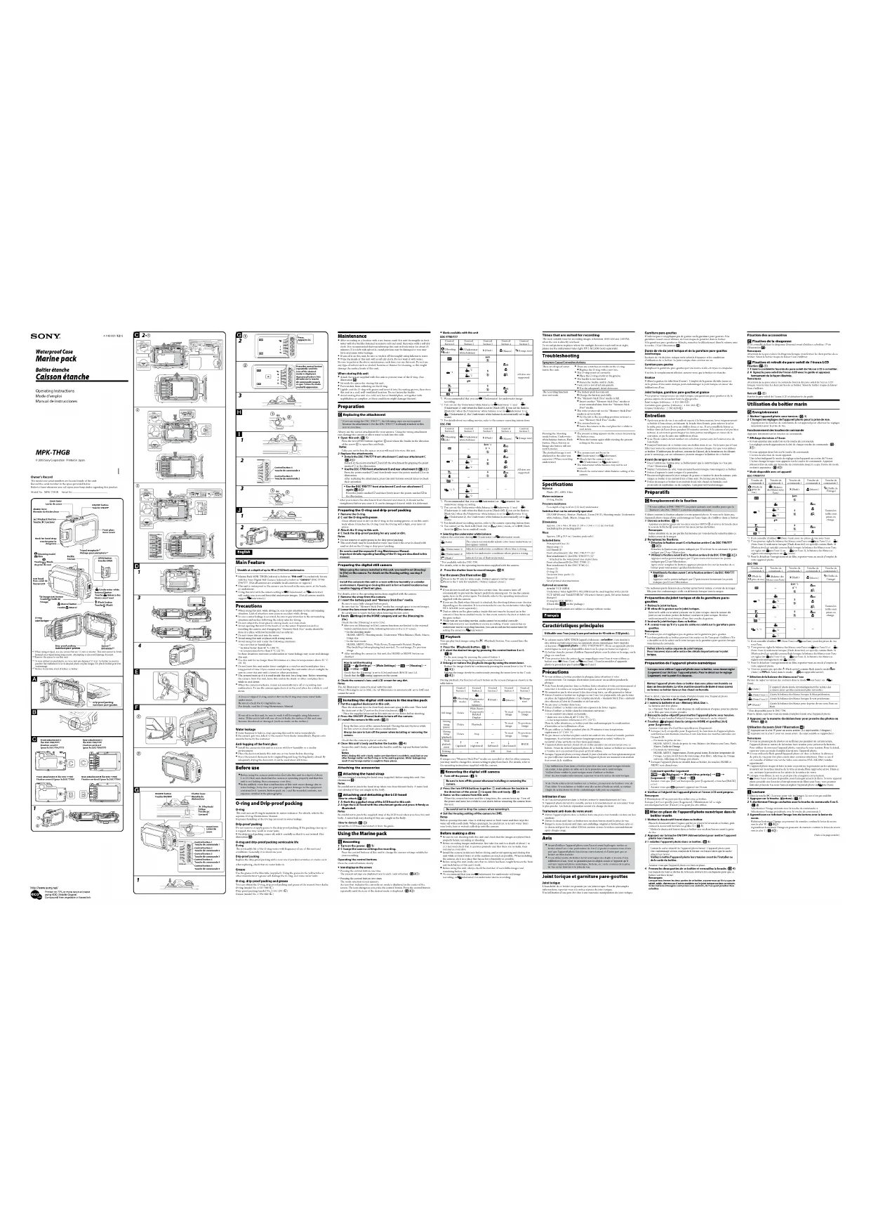 Français Caractéristiques principales Utilisable sous l’eau jusqu’à une profondeur de 40 mètres (132 pieds). Le caisson marin MPK-THGB (appelé ci-dessous « ce boîtier ») est destiné à être utilisé exclusivement avec les appareils photo numériques Sony (appelés ci-dessous « l’appareil photo ») DSC-T700/T90/T77. (Tous ces appareils photos numériques ne sont pas disponibles dans tous les pays ou toutes les régions.)Ce boîtier étanche permet d’utiliser l’appareil photo sous la pluie ou la neige, sur la plage ou sous l’eau.Vous pourrez faire des prises de vue magniques sous l’eau si vous utilisez ce boîtier avec (Sous l’eau) ou (Sous l’eau). (Tous les modèles d’appareils photo ne possèdent pas l’option (Sous l’eau).) Précautions Si vous utilisez ce boîtier pendant la plongée, faites attention à votre environnement. Un manque d’attention peut causer un accident pendant la plongée.Si de l’eau devait pénétrer dans ce boîtier, faites attention à votre environnement et remontez à la surface en respectant les règles de sécurité propres à la plongée.Ne soumettez pas la vitre avant à des chocs trop forts, car elle pourrait se briser.Evitez d’ouvrir ce boîtier sur la plage ou sur l’eau. Les préparatifs, tels que la mise en place de l’appareil photo et le remplacement du « Memory Stick Duo » doivent être eectués à l’abri de l’humidité et de l’air salin.Ne pas jeter ce boîtier dans l’eau.Evitez d’utiliser ce boîtier aux endroits exposés à de fortes vagues.Evitez d’utiliser ce boîtier dans les situations suivantes :à un endroit très chaud ou humide ;dans une eau à plus de 40˚C (104 ˚F) ;à des températures inférieures à 0˚C (32 ˚F).Dans de telles situations, ce boîtier peut être endommagé par la condensation d’humidité ou les inltrations d’eau.Ne pas utiliser ce boîtier pendant plus de 30 minutes à une température supérieure à 35˚C (95 ˚F).Ne pas laisser ce boîtier en plein soleil à un endroit très chaud et humide pendant longtemps. Si ce boîtier doit rester longtemps exposé au soleil, veillez à le recouvrir d’une serviette ou d’un tissu quelconque.L’appareil photo devient chaud s’il est utilisé pendant un certain temps avec ce boîtier. Avant de retirer l’appareil photo de ce boîtier, laissez ce boîtier un moment à l’ombre ou à un endroit frais pour qu’il refroidisse.Lorsque l’appareil photo est trop chaud, il peut s’éteindre ou l’enregistrement peut ne pas s’eectuer normalement. Laissez l’appareil photo un moment à un endroit frais avant de le réutiliser.Une inltration d’eau dans ce boîtier peut être due à un joint torique détendu ou coupé, à des grains de sable ou à de la poussière sur le joint torique. Veillez à bien vérier le joint torique avant d’utiliser ce boîtier. Pour de plus amples informations, reportez-vous à la notice du joint torique.Si de l’huile solaire devait tomber sur ce boîtier, prenez soin de l’enlever avec de l’eau tiède. Si vous laissez ce boîtier avec des taches d’huile au soleil, sa surface risque de se décolorer ou d’être endommagée (elle peut se craqueler).Inltration d’eau Si de l’eau devait pénétrer dans ce boîtier, retirez-le immédiatement de l’eau.Si l’appareil photo devait être mouillé, portez-le immédiatement au revendeur Sony le plus proche. Les frais de réparation seront à la charge du client.Traitement anti-buée du verre avant Mettez l’appareil photo dans ce boîtier dans une pièce non humide ou dans un lieu similaire.Mettez le dessiccatif dans ce boîtier une ou deux heures avant la prise de vue.Rangez le reste du dessiccatif dans son emballage original et fermez bien celui-ci. Le dessiccatif peut être utilisé 200 fois environ si vous le séchez convenablement après chaque usage. Avis Avant d’utiliser l’appareil photo sous l’eau et avant la plongée, mettez ce boîtier dans l’eau à une profondeur de 1 m (3,3 pieds) et assurez-vous d’une part que l’appareil photo fonctionne correctement et d’autre part que ce boîtier est bien étanche.Si une défectuosité du boîtier devait provoquer des dégâts à la suite d’une inltration d’eau, Sony ne garantira pas les dégâts causés à l’appareil qu’il contient (appareil photo numérique, batterie, etc.) ni le contenu de la prise de vue ou les frais liés à la prise de vue.