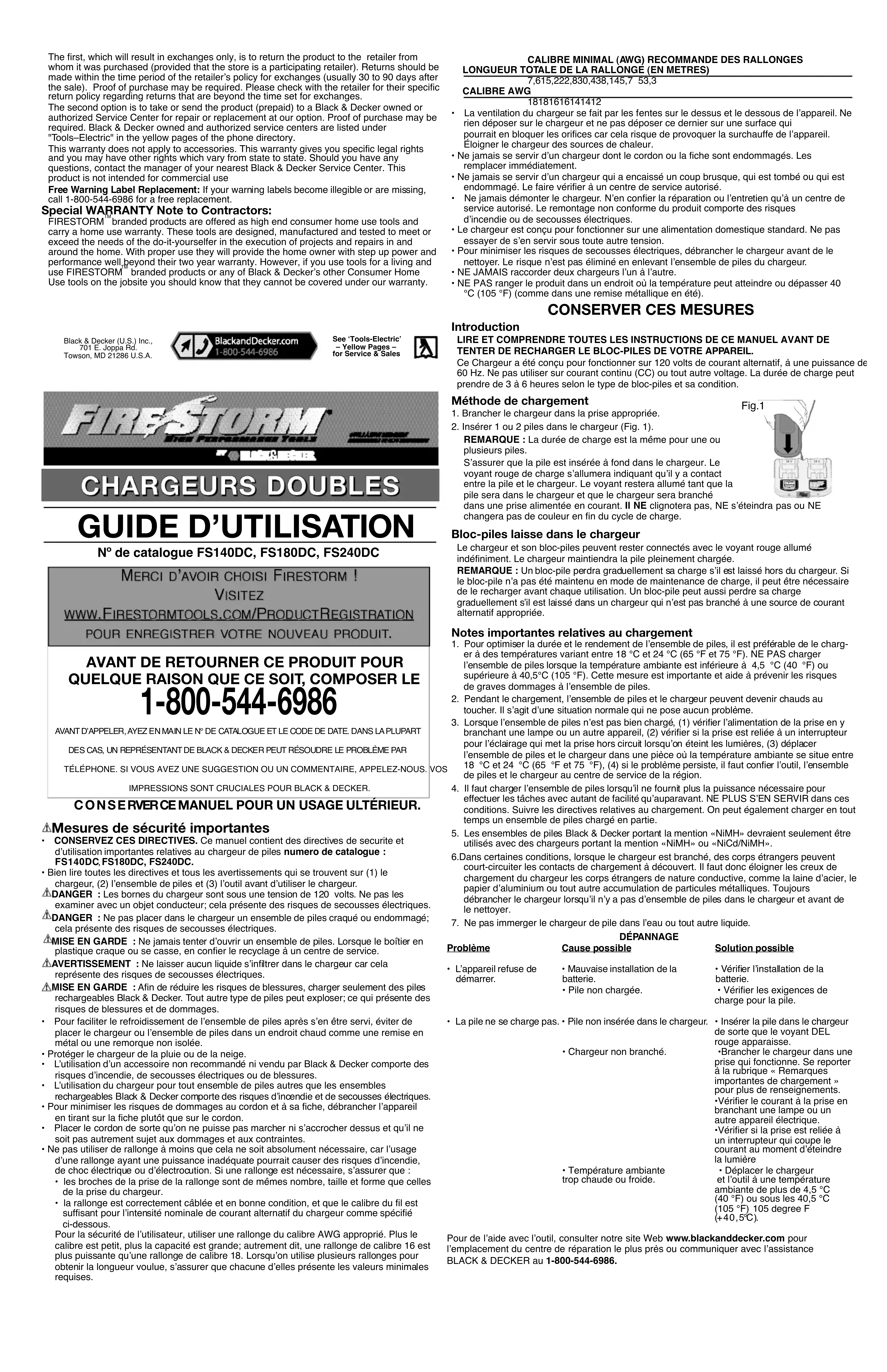 - Battery will not charge. • Battery not inserted into charger. • Insert battery into charger until red LED appears. • Charger not plugged in. • Plug charger into a working outlet. Refer to “Important Charging Notes” for more d e t a i l s .• Check current at receptacle by plugging in a lamp or other a p p l i a n c e .• Check to see if receptacle isconnected to a light switch which turns power off when you turn out the lights. • Surrounding air temperature • Move charger and tool to a too hot or too cold. surrounding air temperature of above 40 degree F(4 , 5°C) or below 105 degree F (+ 4 0 , 5°C ). For assistance with your product, visit our website www.blackanddecker.com for the location of the service center nearest you or call the BLACK & DECKER help line at 1-800-544-6986.The first, which will result in exchanges only, is to return the product to the retailer fromwhom it was purchased (provided that the store is a participating retailer). Returns should bemade within the time period of the retailer’s policy for exchanges (usually 30 to 90 days afterthe sale). Proof of purchase may be required. Please check with the retailer for their specificreturn policy regarding returns that are beyond the time set for exchanges.The second option is to take or send the product (prepaid) to a Black & Decker owned orauthorized Service Center for repair or replacement at our option. Proof of purchase may berequired. Black & Decker owned and authorized service centers are listed under" Tools–Electric" in the yellow pages of the phone directory.This warranty does not apply to accessories. This warranty gives you specific legal rightsand you may have other rights which vary from state to state. Should you have any questions, contact the manager of your nearest Black & Decker Service Center. This product is not intended for commercial use Free Warning Label Replacement: If your warning labels become illegible or are missing, call 1-800-544-6986 for a free replacement.Special WARRANTY Note to Contractors:F I R E S T O R M branded products are offered as high end consumer home use tools andcarry a home use warranty. These tools are designed, manufactured and tested to meet orexceed the needs of the do-it-yourselfer in the execution of projects and repairs in andaround the home. With proper use they will provide the home owner with step up power andperformance well beyond their two year warranty. However, if you use tools for a living anduse FIRESTO R M T M branded products or any of Black & Decker’s other Consumer HomeUse tools on the jobsite you should know that they cannot be covered under our warranty.CALIBRE MINIMAL ( AWG) RECOMMANDE DES RALLONGESLONGUEUR TO TALE DE LA RALLONGE (EN METRES)7 , 6 1 5 , 2 2 2 , 8 3 0 , 4 3 8 , 1 45,7 5 3 , 3CALIBRE AW G1 8 1 8 1 6 1 6 1 4 1 4 1 2