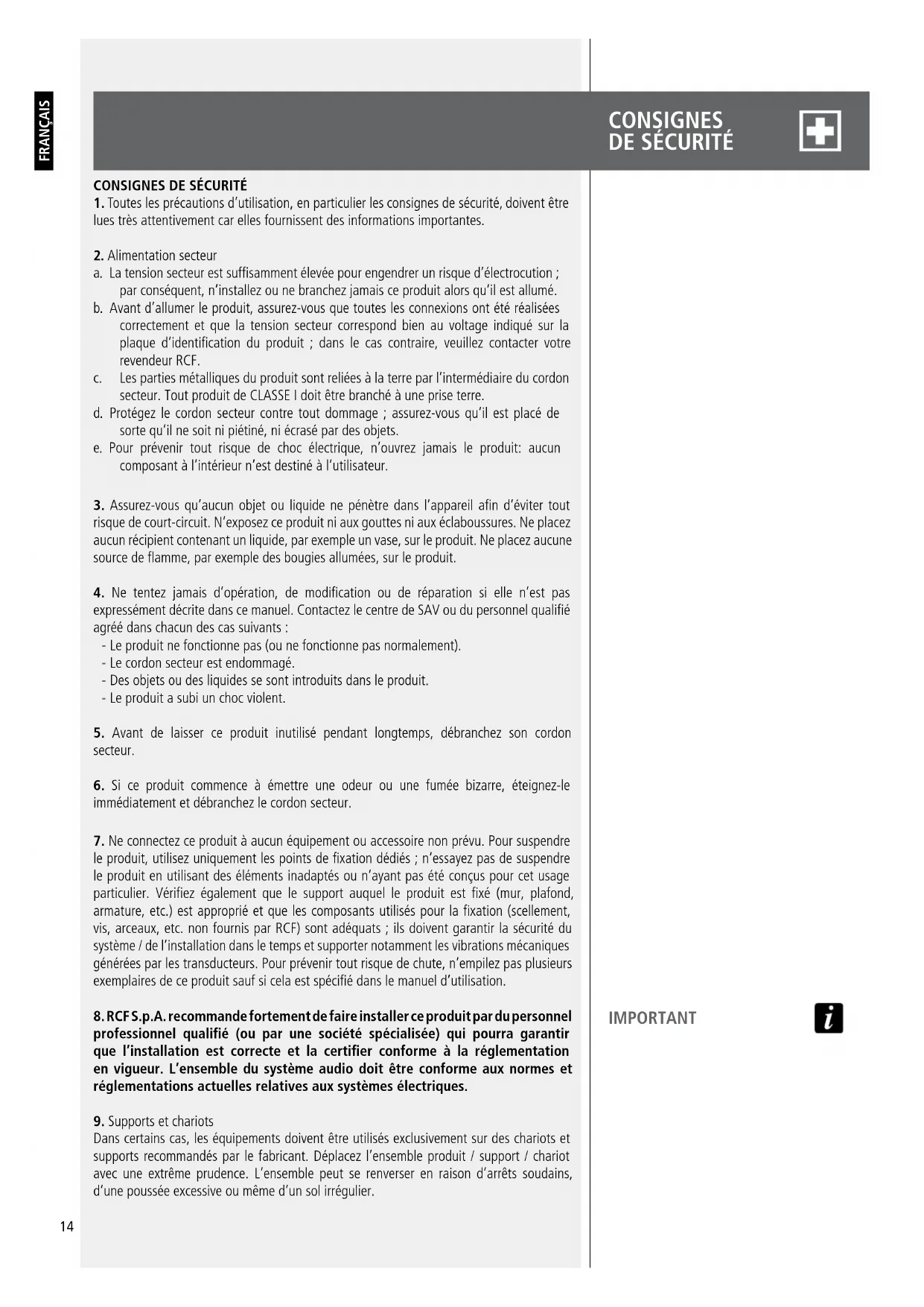 8. RCF S.p.A. recommande fortement de faire installer ce produit par du personnel