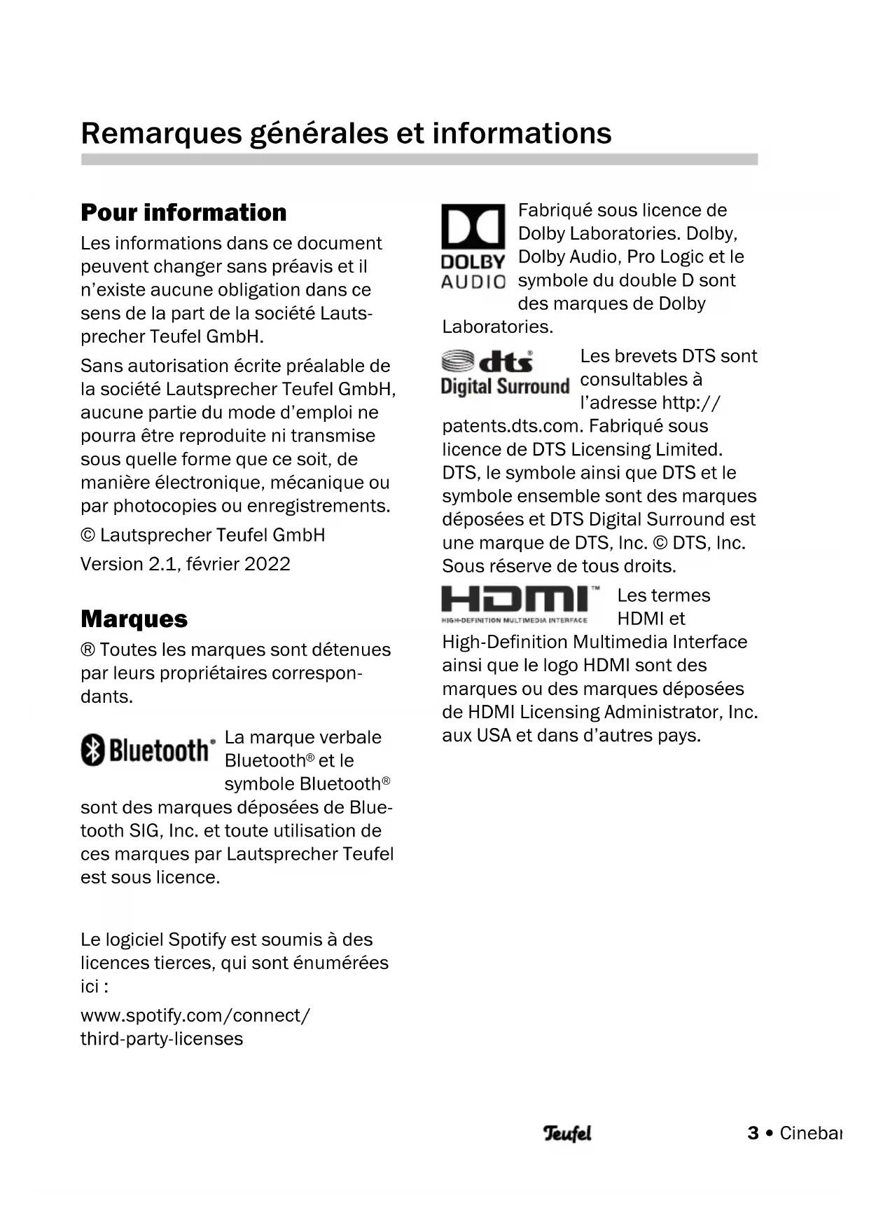 - Informations importantes en vertu de la loi allemande sur les piles et les accumulateurs (Elektro G) • Cinebar LUX Remarques générales et informations Pour information Les informations dans ce document peuvent changer sans préavis et il n’existe aucune obligation dans ce sens de la part de la société Lauts- precher Teufel GmbH. Sans autorisation écrite préalable de la société Lautsprecher Teufel GmbH, aucune partie du mode d’emploi ne pourra être reproduite ni transmise sous quelle forme que ce soit, de manière électronique, mécanique ou par photocopies ou enregistrements. © Lautsprecher Teufel GmbH Version 2.1, février 2022 Marques ® Toutes les marques sont détenues par leurs propriétaires correspon- dants. La marque verbale Bluetooth p. 413