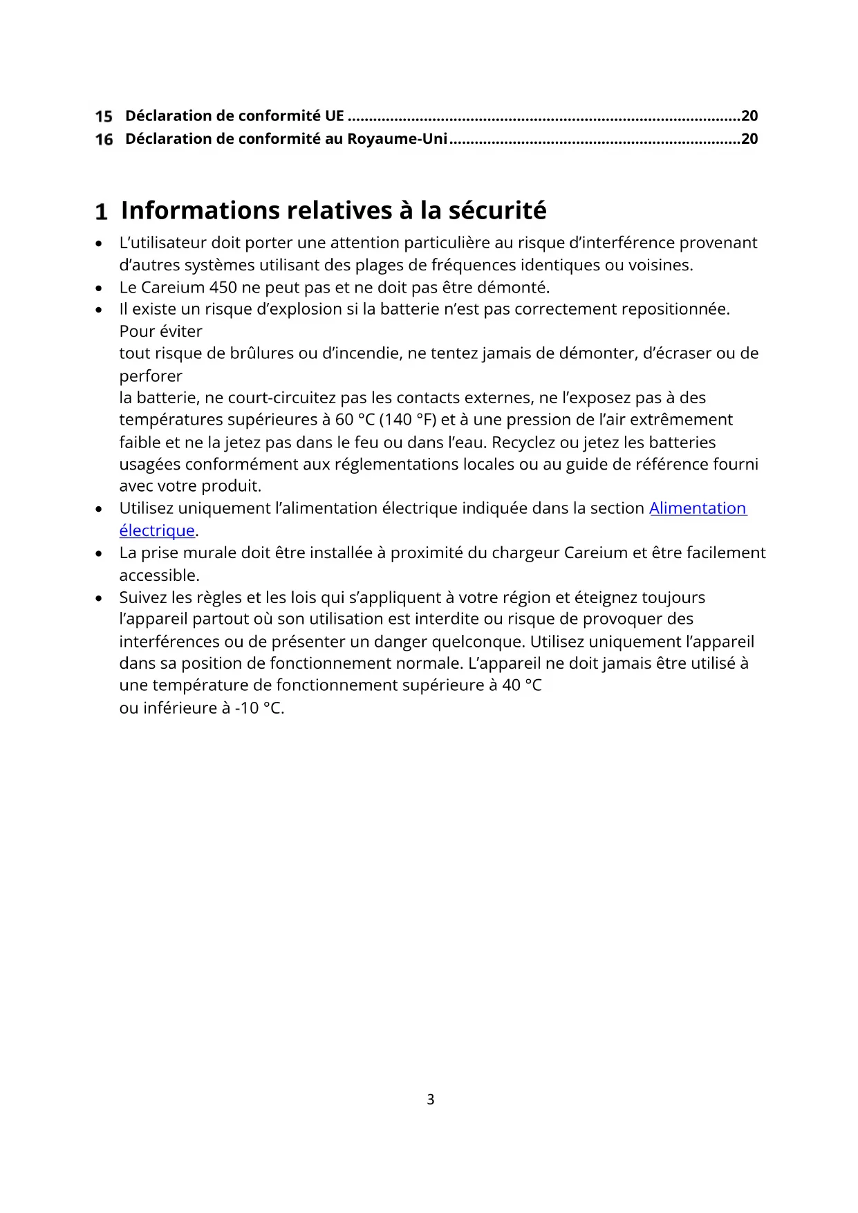 (applicable dans les pays disposant de systèmes de collecte spéciaux) La présence de ce symbole sur la batterie, sur le manuel ou sur l’emballage indique que la batterie du produit ne doit pas être jetée avec les déchets ménagers. Lorsqu’ils sont présents, les symboles chimiques Hg, Cd ou Pb indiquent que la batterie contient du mercure, du cadmium ou du plomb à des teneurs supérieures aux valeurs de référence de la directive européenne 2006/66/CE relative aux batteries. Si les batteries ne sont pas mises au rebut correctement, ces substances risqueront de nuire à la santé humaine ou à l’environnement. Pour protéger les ressources naturelles et favoriser leur réutilisation, mettez au rebut les batteries séparément et recyclez-les en les plaçant dans le point de collecte de batteries municipal. Déclaration de conformité UE Careium déclare par la présente que l’équipement radio Careium 450 est conforme aux directives suivantes : 2014/53/UE et 2011/65/UE y compris la directive déléguée (UE) 2015/863 modifiant l’annexe II. Le texte intégral de la déclaration de conformité UE est disponible à l’adresse Internet suivante : www.careium.com/dofc. Déclaration de conformité au Royaume-Uni Careium déclare par la présente que l’équipement radio Careium 450 est conforme aux lois du Royaume-Uni applicables. Le texte intégral de la déclaration de conformité au Royaume-Uni est disponible à l’adresse Internet suivante : www.careium.com/dofc21