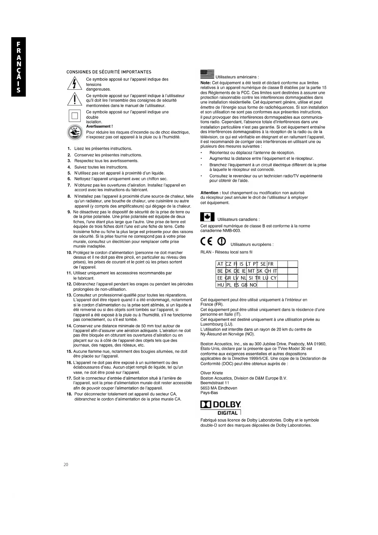 - Consultez le revendeur ou un technicien radio/TV expérimenté pour obtenir de l’aide. Attention : tout changement ou modification non autorisé du récepteur peut annuler le droit de l’utilisateur à employer cet équipement. Utilisateurs canadiens : Cet appareil numérique de classe B est conforme à la norme canadienne NMB-003. Cet équipement peut être utilisé uniquement à l’intérieur en France (FR). Cet équipement peut être utilisé uniquement dans la résidence d’une personne en Italie (IT). Cet équipement est destiné uniquement à une utilisation privée au Luxembourg (LU). L’utilisation est interdite dans un rayon de 20 km du centre de Ny-Ålesund en Norvège (NO). Boston Acoustics, Inc., sis au 300 Jubilee Drive, Peabody, MA 01960, États-Unis, déclare par la présente que ce TVee Model 30 est conforme aux exigences essentielles et autres dispositions applicables de la Directive 1999/5/CE. Une copie de la Déclaration de Conformité (DOC) peut être obtenue auprès de : Oliver Kriete Boston Acoustics, Division de D&M Europe B.V. Beemdstraat 11 5653 MA Eindhoven Pays-Bas Fabriqué sous licence de Dolby Laboratories. Dolby et le symbole double-D sont des marques déposées de Dolby Laboratories.