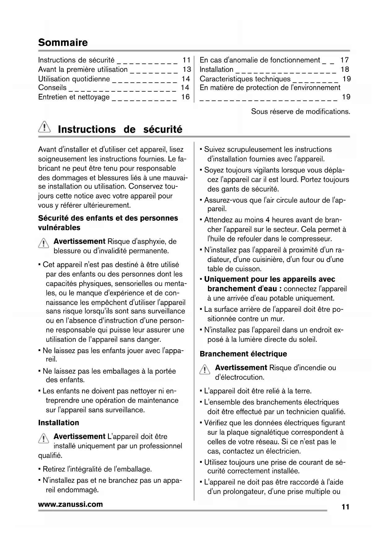 www.zanussi.comSommaire Instructions de sécurité _ _ _ _ _ _ _ _ _ _ 11 Avant la première utilisation _ _ _ _ _ _ _ _ 13 Utilisation quotidienne _ _ _ _ _ _ _ _ _ _ _ 14 Conseils _ _ _ _ _ _ _ _ _ _ _ _ _ _ _ _ _ _ 14 Entretien et nettoyage _ _ _ _ _ _ _ _ _ _ _ 16 En cas d'anomalie de fonctionnement _ _ 17 Installation _ _ _ _ _ _ _ _ _ _ _ _ _ _ _ _ _ 18 Caracteristiques techniques _ _ _ _ _ _ _ _ 19 En matière de protection de l'environnement _ _ _ _ _ _ _ _ _ _ _ _ _ _ _ _ _ _ _ _ _ _ _ 19 Sous réserve de modifications. Instructions de sécurité Avant d'installer et d'utiliser cet appareil, lisez soigneusement les instructions fournies. Le fa- bricant ne peut être tenu pour responsable des dommages et blessures liés à une mauvai- se installation ou utilisation. Conservez tou- jours cette notice avec votre appareil pour vous y référer ultérieurement. Sécurité des enfants et des personnes vulnérables Avertissement Risque d'asphyxie, de blessure ou d'invalidité permanente.