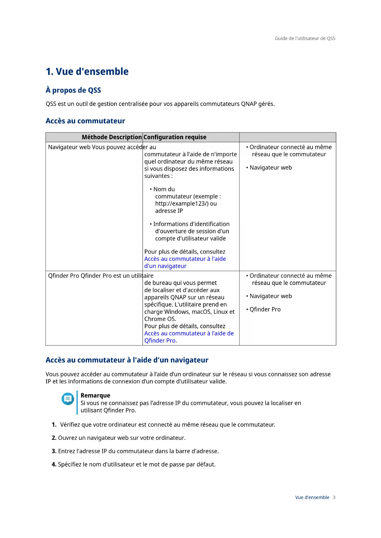 QSS réinitialise le commutateur aux paramètres d'usine par défaut. Remarque Pour vous reconnecter à l’interface, vous devez localiser l’appareil à l’aide de Qnder Pro. Pour plus de détails, consultez Accès au commutateur. Mise à jour du rmware QNAP recommande de maintenir le rmware de votre appareil à jour. Vous serez ainsi certain que votre appareil pourra proter des nouvelles fonctionnalités logicielles de QSS, mises à jour de sécurité, améliorations et corrections de bugs. Vous pouvez mettre à jour le rmware en utilisant l’une des méthodes suivantes : Méthode de mise à jour Description En utilisant Mise à jour en direct Les mises à jour du rmware sont automatiquement détectées par QSS et installées sur votre appareil. Pour des détails, consultez Recherche de mises à jour automatiques. En utilisant Mise à jour du rmware Vous pouvez rechercher les dernières mises à jour du rmware de l’appareil sur le site Web QNAP, télécharger la mises à jour du rmware sur un ordinateur et l’installer manuellement sur votre appareil. Pour des détails, consultez Mise à jour manuelle du rmware. Guide de l'utilisateur de QSS Système 27Méthode de mise à jour Description En utilisant Qnder Pro Si votre appareil est connecté au réseau local, vous pouvez utiliser Qnder Pro pour rechercher et installer les dernières mises à jour du rmware. Pour des détails, consultez Mise à jour du rmware à l’aide de Qnder Pro. Conguration de rmware requise Votre appareil doit correspondre à la conguration requise suivante pour eectuer une mise à jour du rmware : Paramètres Conguration requise Paramètres matériels • Un ordinateur
