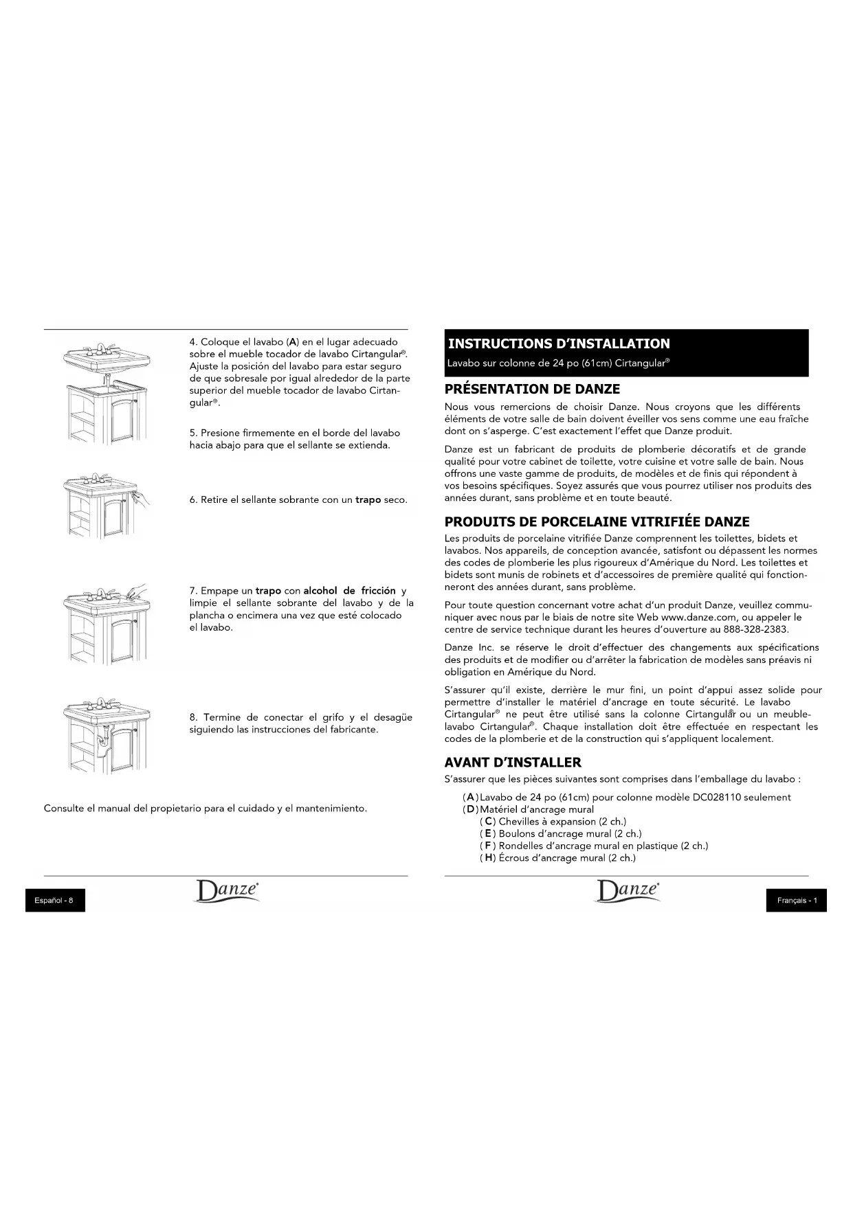 siguiendo las instrucciones del fabricante. Consulte el manual del propietario para el cuidado y el mantenimiento. PrésentatIon de danze Nous vous remercions de choisir Danze. Nous croyons que les différents éléments de votre salle de bain doivent éveiller vos sens comme une eau fraîche dont on s’asperge. C’est exactement l’effet que Danze produit. Danze est un fabricant de produits de plomberie décoratifs et de grande qualité pour votre cabinet de toilette, votre cuisine et votre salle de bain. Nous offrons une vaste gamme de produits, de modèles et de finis qui répondent à vos besoins spécifiques. Soyez assurés que vous pourrez utiliser nos produits des années durant, sans problème et en toute beauté. ProduIts de PorceLaIne VItrIFIée danze Les produits de porcelaine vitrifiée Danze comprennent les toilettes, bidets et lavabos. Nos appareils, de conception avancée, satisfont ou dépassent les normes des codes de plomberie les plus rigoureux d’Amérique du Nord. Les toilettes et bidets sont munis de robinets et d’accessoires de première qualité qui fonction- neront des années durant, sans problème. Pour toute question concernant votre achat d’un produit Danze, veuillez commu- niquer avec nous par le biais de notre site Web www.danze.com, ou appeler le centre de service technique durant les heures d’ouverture au 888-328-2383. Danze Inc. se réserve le droit d’effectuer des changements aux spécifications des produits et de modifier ou d’arrêter la fabrication de modèles sans préavis ni obligation en Amérique du Nord. S’assurer qu’il existe, derrière le mur fini, un point d’appui assez solide pour permettre d’installer le matériel d’ancrage en toute sécurité. Le lavabo Cirtangular