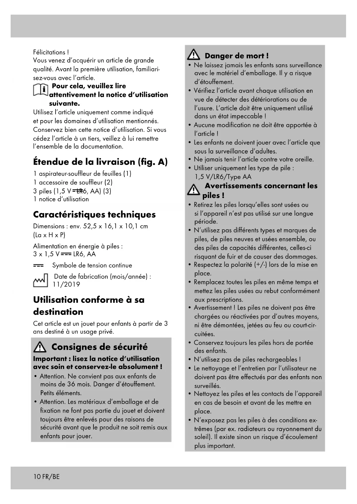 - s‘il présente les qualités qu‘un acheteur peut légitimement attendre eu égard aux déclara- tions publiques faites par le vendeur, par le producteur ou par son représentant, notam- ment dans la publicité ou l‘étiquetage ;13FR/BE 2° Ou s‘il présente les caractéristiques définies d‘un commun accord par les parties ou être propre à tout usage spécial recherché par l‘acheteur, porté à la connaissance du vendeur et que ce dernier a accepté. Article L217-12 du Code de la consommation L‘action résultant du défaut de conformité se prescrit par deux ans à compter de la délivrance du bien. Article 1641 du Code civil Le vendeur est tenu de la garantie à raison des défauts cachés de la chose vendue qui la ren- dent impropre à l‘usage auquel on la destine, ou qui diminuent tellement cet usage que l‘acheteur ne l‘aurait pas acquise, ou n‘en aurait donné qu‘un moindre prix, s‘il les avait connus. Article 1648 1er alinéa du Code civil L‘action résultant des vices rédhibitoires doit être intentée par l‘acquéreur dans un délai de deux ans à compter de la découverte du vice. Les pièces détachées indispensables à l’utilisation du produit sont disponibles pendant la durée de la garantie du produit. IAN : 327454_1904 Service Belgique Tel. : 070 270 171 (0,15 EUR/Min.) E-Mail : deltasport@lidl.be14 NL/BE Gefeliciteerd! Met uw aankoop hebt u voor een hoogwaardig artikel gekozen. Zorg ervoor dat u voor het eerste gebruik met het artikel vertrouwd raakt. Lees hiervoor de volgende geb- ruiksaanwijzing zorgvuldig door. Gebruik het artikel alleen zoals omschreven en voor het aangegeven doel. Bewaar deze geb- ruiksaanwijzing goed. Geef alle documenten mee als u het artikel aan iemand anders geeft. Leveringsomvang (afb. A) 1 x bladblazer (1) 1 x blaasopzetstuk (2) 3 x batterij (1,5 V LR6, AA) (3) 1 x gebruiksaanwijzing Technische gegevens Afmetingen: ca. 52,5 x 16,1 x 10,1 cm (b x h x d) Stroomvoorziening batterij: 3 x 1,5 V LR6, AA Symbool voor gelijkspanning Productiedatum (maand/jaar): 11/2019 Beoogd gebruik Dit artikel is speelgoed voor kinderen vanaf 3 jaar oud voor privégebruik. Veiligheidstips Belangrijk: lees deze gebruiksaanwij- zing zorgvuldig door en bewaar hem vervolgens goed!