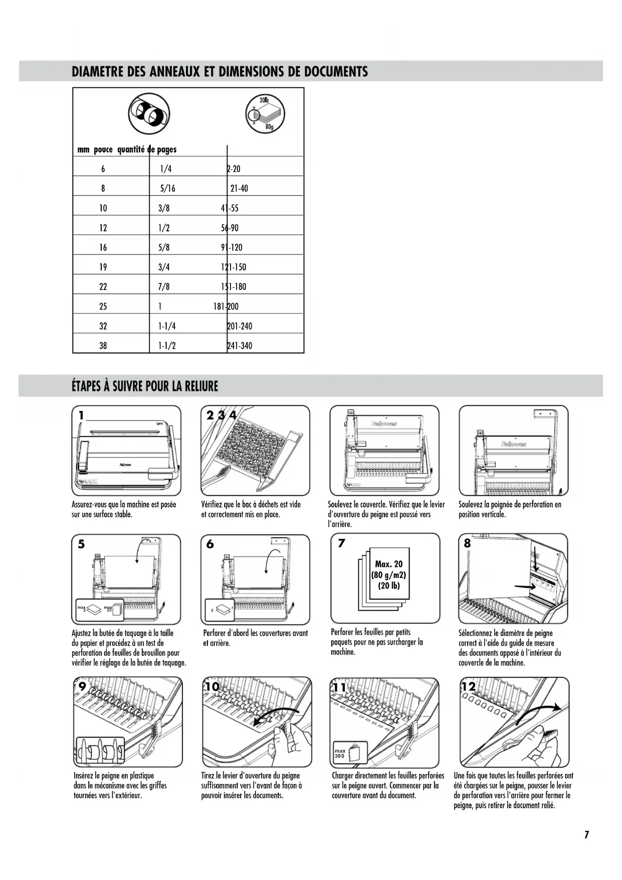 Assurez-vous que la machine est posée sur une surface stable. 7ÏSJmF[RVFMFCBDËEÏDIFUTFTUWJEFet correctement mis en place. 4PVMFWF[MFDPVWFSDMF7ÏSJmF[RVFMFMFWJFSd'ouverture du peigne est poussé vers l'arrière.Soulevez la poignée de perforation en position verticale.Sélectionnez le diamètre de peigne correct à l'aide du guide de mesure des documents apposé à l'intérieur du couvercle de la machine.Insérez le peigne en plastique dans le mécanisme avec les griffes tournées vers l'extérieur. 5JSF[MFMFWJFSEhPVWFSUVSFEVQFJHOFTVGmTBNNFOUWFSTMhBWBOUEFGBÎPOËpouvoir insérer les documents.Ajustez la butée de taquage à la taille du papier et procédez à un test de perforation de feuilles de brouillon pour WÏSJmFSMFSÏHMBHFEFMBCVUÏFEFUBRVBHFPerforer d'abord les couvertures avant et arrière.Perforer les feuilles par petits paquets pour ne pas surcharger la machine.Charger directement les feuilles perforées sur le peigne ouvert. Commencer par la couverture avant du document.6OFGPJTRVFUPVUFTMFTGFVJMMFTQFSGPSÏFTPOUÏUÏDIBSHÏFTTVSMFQFJHOFQPVTTFSMFMFWJFSde perforation vers l'arrière pour fermer le QFJHOFQVJTSFUJSFSMFEPDVNFOUSFMJÏMax. 20 (80 g/m2) (20 lb)