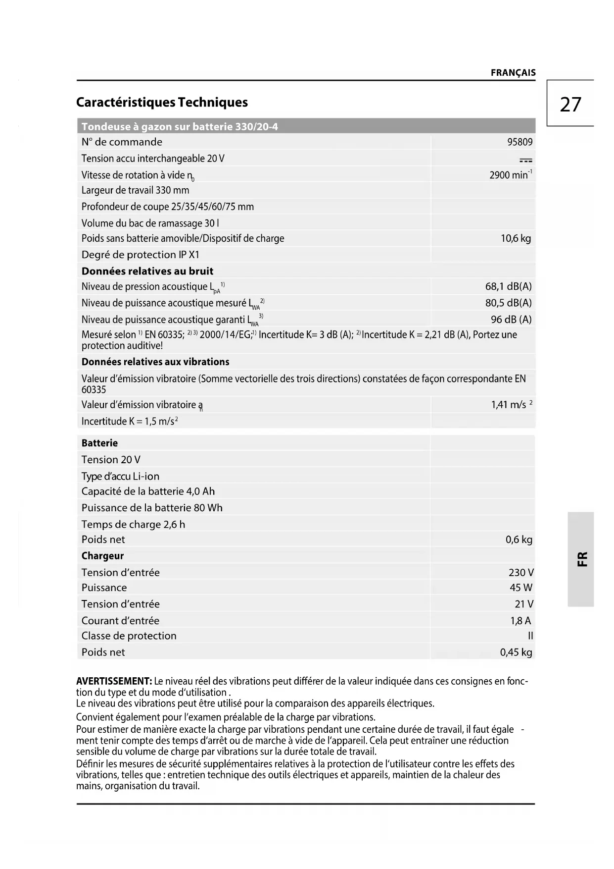 Caractéristiques Techniques Tondeuse à gazon sur batterie 330/20-4 N° de commande