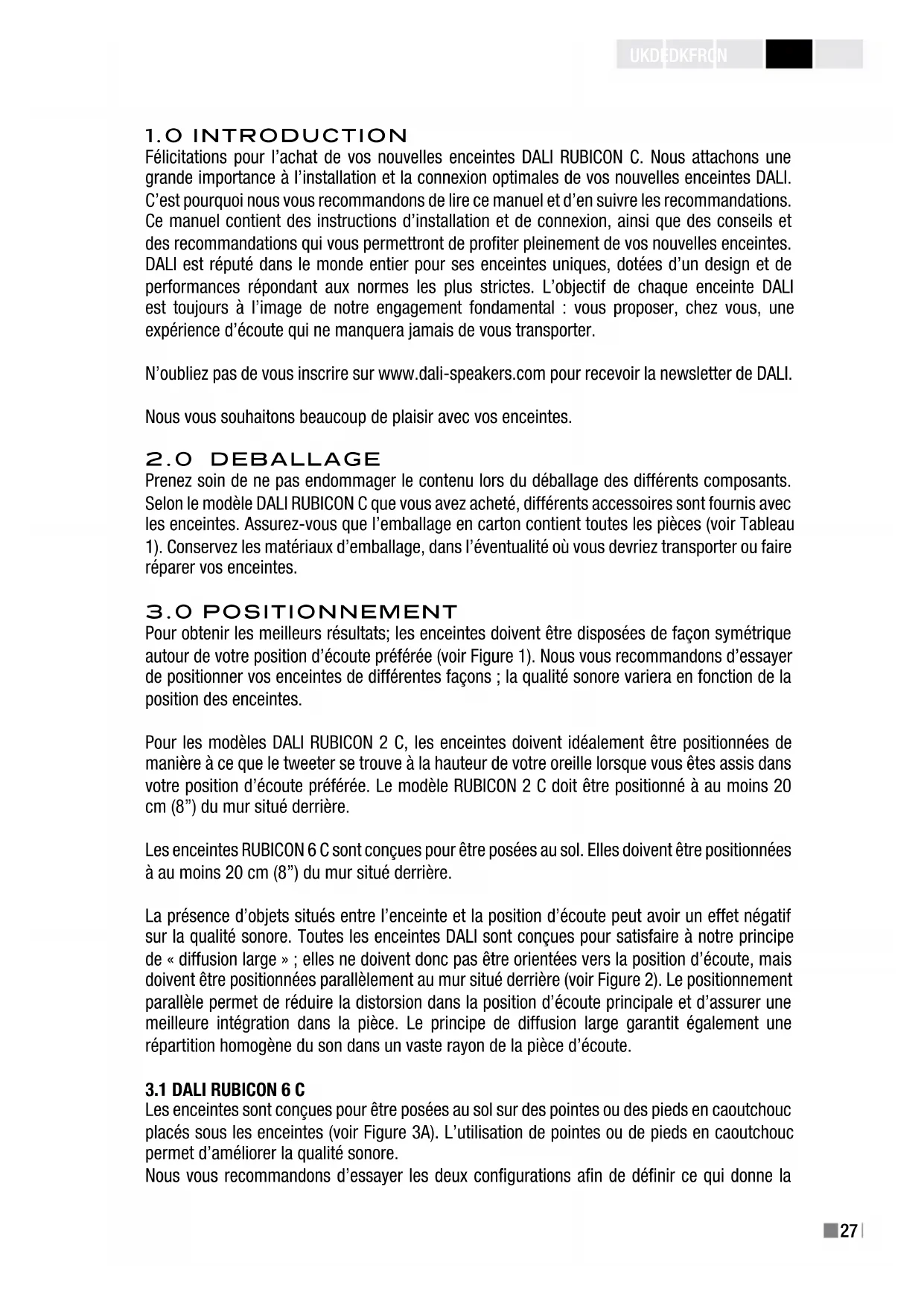 Félicitations pour l’achat de vos nouvelles enceintes DALI RUBICON C. Nous attachons une grande importance à l’installation et la connexion optimales de vos nouvelles enceintes DALI. C’est pourquoi nous vous recommandons de lire ce manuel et d’en suivre les recommandations. Ce manuel contient des instructions d’installation et de connexion, ainsi que des conseils et des recommandations qui vous permettront de profiter pleinement de vos nouvelles enceintes. DALI est réputé dans le monde entier pour ses enceintes uniques, dotées d’un design et de performances répondant aux normes les plus strictes. L’objectif de chaque enceinte DALI est toujours à l’image de notre engagement fondamental : vous proposer, chez vous, une expérience d’écoute qui ne manquera jamais de vous transporter. N’oubliez pas de vous inscrire sur www.dali-speakers.com pour recevoir la newsletter de DALI. Nous vous souhaitons beaucoup de plaisir avec vos enceintes.