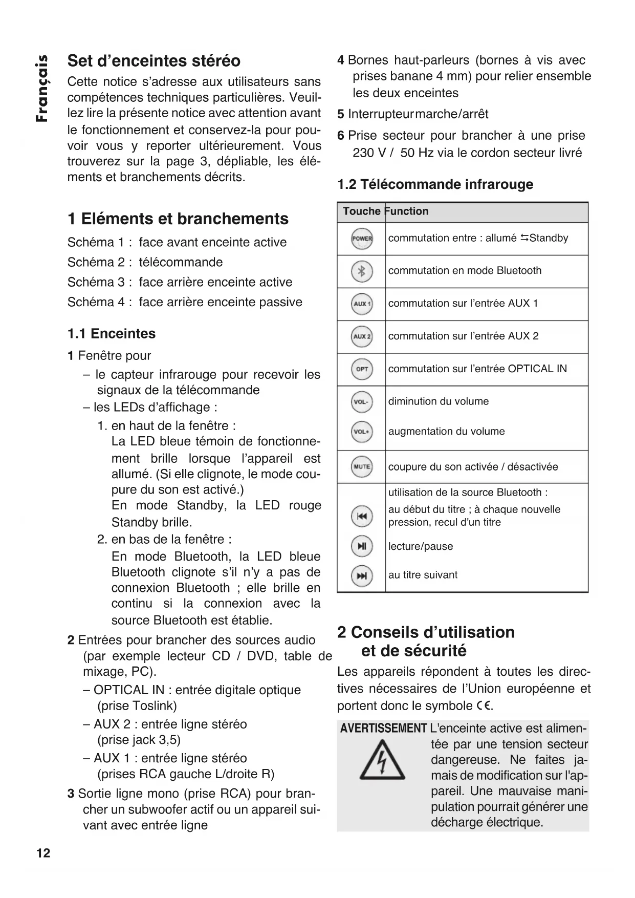 AVERTISSEMENT L'enceinte active est alimen- tée par une tension secteur dangereuse. Ne faites ja- mais de modification sur l'ap- pareil. Une mauvaise mani- pulation pourrait générer une décharge électrique. Touche Functioncommutation entre : allumé Standbycommutation en mode Bluetoothcommutation sur lʼentrée AUX 1commutation sur lʼentrée AUX 2commutation sur lʼentrée OPTICAL INdiminution du volumeaugmentation du volumecoupure du son activée / désactivéeutilisation de la source Bluetooth :au début du titre ; à chaque nouvellepression, recul d'un titrelecture / pauseau titre suivantG Les appareils ne sont conçus que pour une utilisation en intérieur. Protégez-les de tout type de projections d'eau, des éclabous- sures, d'une humidité élevée de l'air et de la chaleur (plage de température de fonction- nement autorisée : 0 – 40 °C).