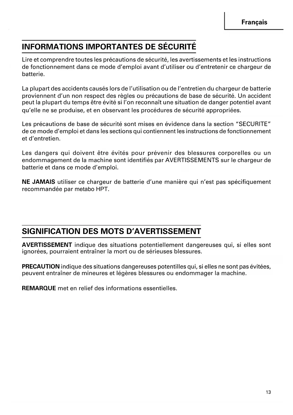 Lire et comprendre toutes les précautions de sécurité, les avertissements et les instructions de fonctionnement dans ce mode d’emploi avant d’utiliser ou d’entretenir ce chargeur de batterie. La plupart des accidents causés lors de l’utilisation ou de l’entretien du chargeur de batterie proviennent d’un non respect des règles ou précautions de base de sécurité. Un accident peut la plupart du temps être évité si l’on reconnaît une situation de danger potentiel avant qu’elle ne se produise, et en observant les procédures de sécurité appropriées. Les précautions de base de sécurité sont mises en évidence dans la section “SECURITE” de ce mode d’emploi et dans les sections qui contiennent les instructions de fonctionnement et d’entretien. Les dangers qui doivent être évités pour prévenir des blessures corporelles ou un endommagement de la machine sont identifiés par AVERTISSEMENTS sur le chargeur de batterie et dans ce mode d’emploi. NE JAMAIS utiliser ce chargeur de batterie d’une manière qui n’est pas spécifiquement recommandée par metabo HPT.