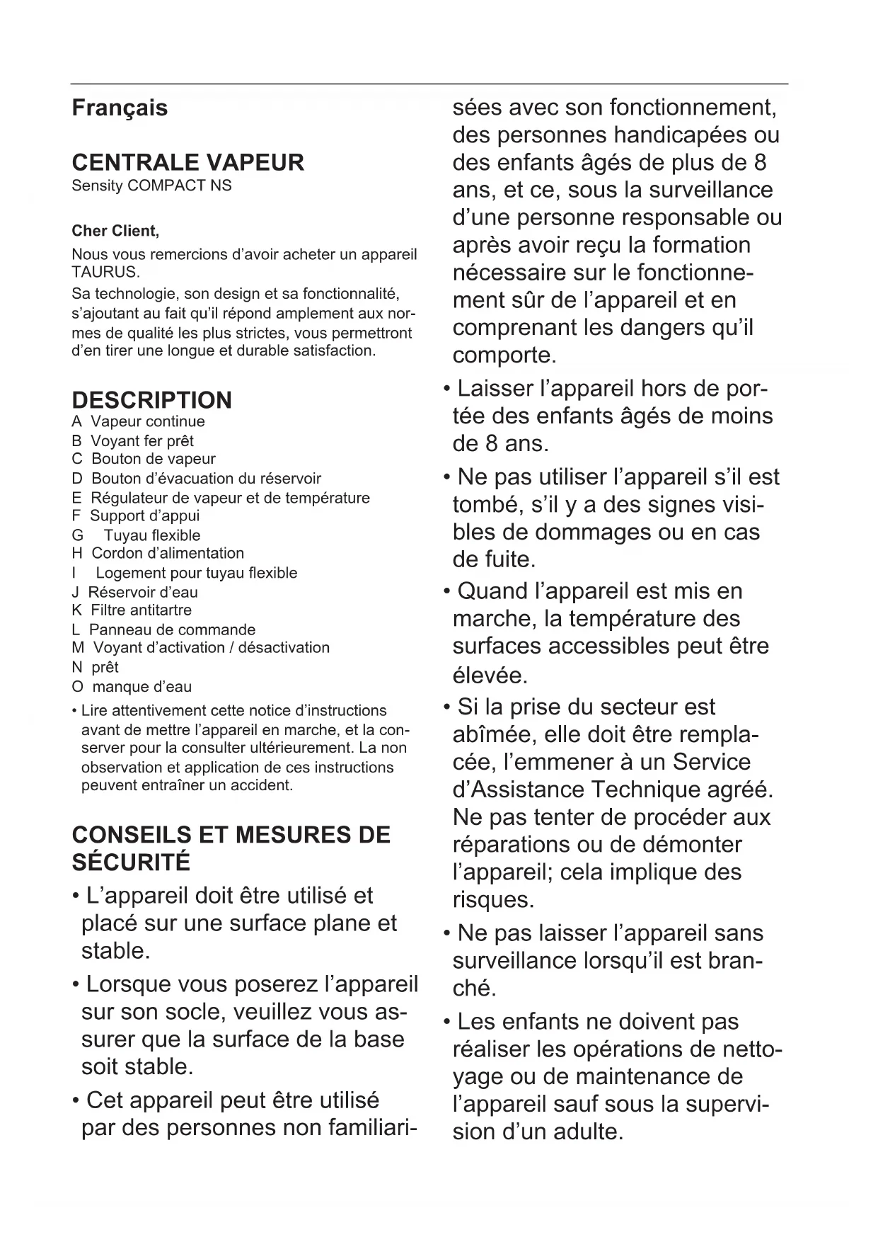MODE D'EMPLOI Sensity Compact Non Stop TAURUS