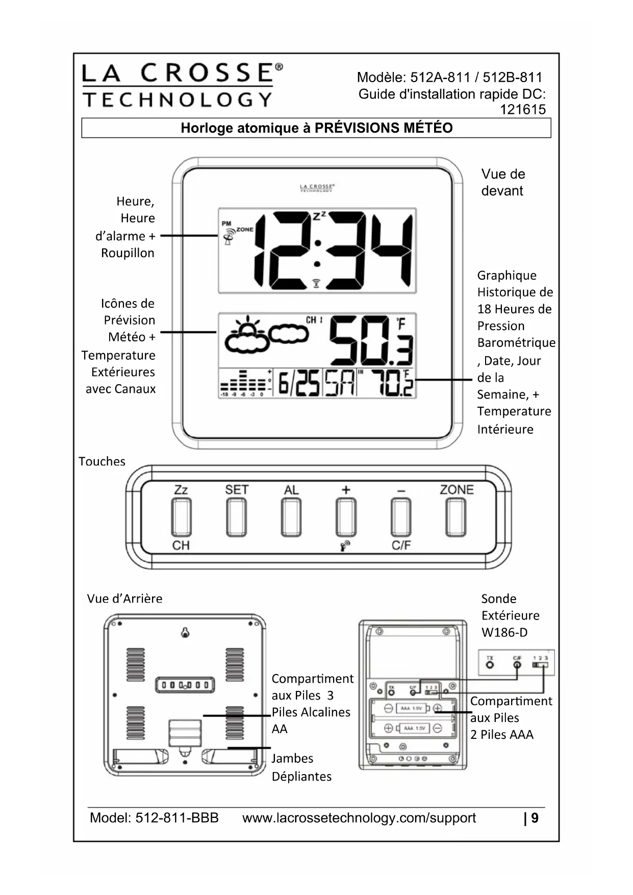 - Consulter le revendeur ou un technicien radio / TV expérimenté. Ce dispositif ne doit être co-localisé ou opéré en conjonction avec n’importe autre antenne ou transmetteur. Son fonctionnement est soumis aux deux conditions suivantes: (1) Ce dispositif peut ne pas causer des interférences nuisibles, et (2) Cet appareil doit accepter toute interférence reçue, y compris les interférences qui peuvent provoquer un fonctionnement indésirable. Mise en garde! Le fabricant n’est pas responsable des interférences radio ou télévision causées par des modifications non autorisées de cet équipement. Ces modifications pourraient annuler l'autorité de l'utilisateur à utiliser l'équipement. Tous droits réservés. Ce manuel ne peut être reproduite sous aucune forme, même partielle, ou dupliqué ou traité à l'aide d’un processus mécanique ou chimique électronique sans la permission écrite de l'éditeur. Cette brochure peut contenir des erreurs ou des fautes d'impression. L'information qu'il contient est régulièrement vérifiée, les corrections sont incluses dans les éditions ultérieures. Nous déclinons toute responsabilité pour toute erreur technique ou d'une erreur d'impression, ou de leurs conséquences. Tous les marques et brevets sont reconnus.Modelo: 512-811-BBB www.lacrossetechnology.com/support | 17 Modelo: 512-811-BBB Guía de configuración rápida DC:121615 RELOJ ATOMICO CON PRONÓSTICO DEL CLIMA Hora, Alarma + Snooze Iconos del Pronostico del clima + Temperatura exterior con canales Historial grafico de Presión de 18-horas, Fecha, día de la semana +Temperatura Interior Compartimento de baterías. 3 baterías Alcalinas tipo “AA” Soportes plegables Compartimento de baterías 2 baterías tipo “AAA” W186-D Sensor exterior Botones Vista Posterior Vista FrontalModelo: 512-811-BBB www.lacrossetechnology.com/support | 18 Inicio
