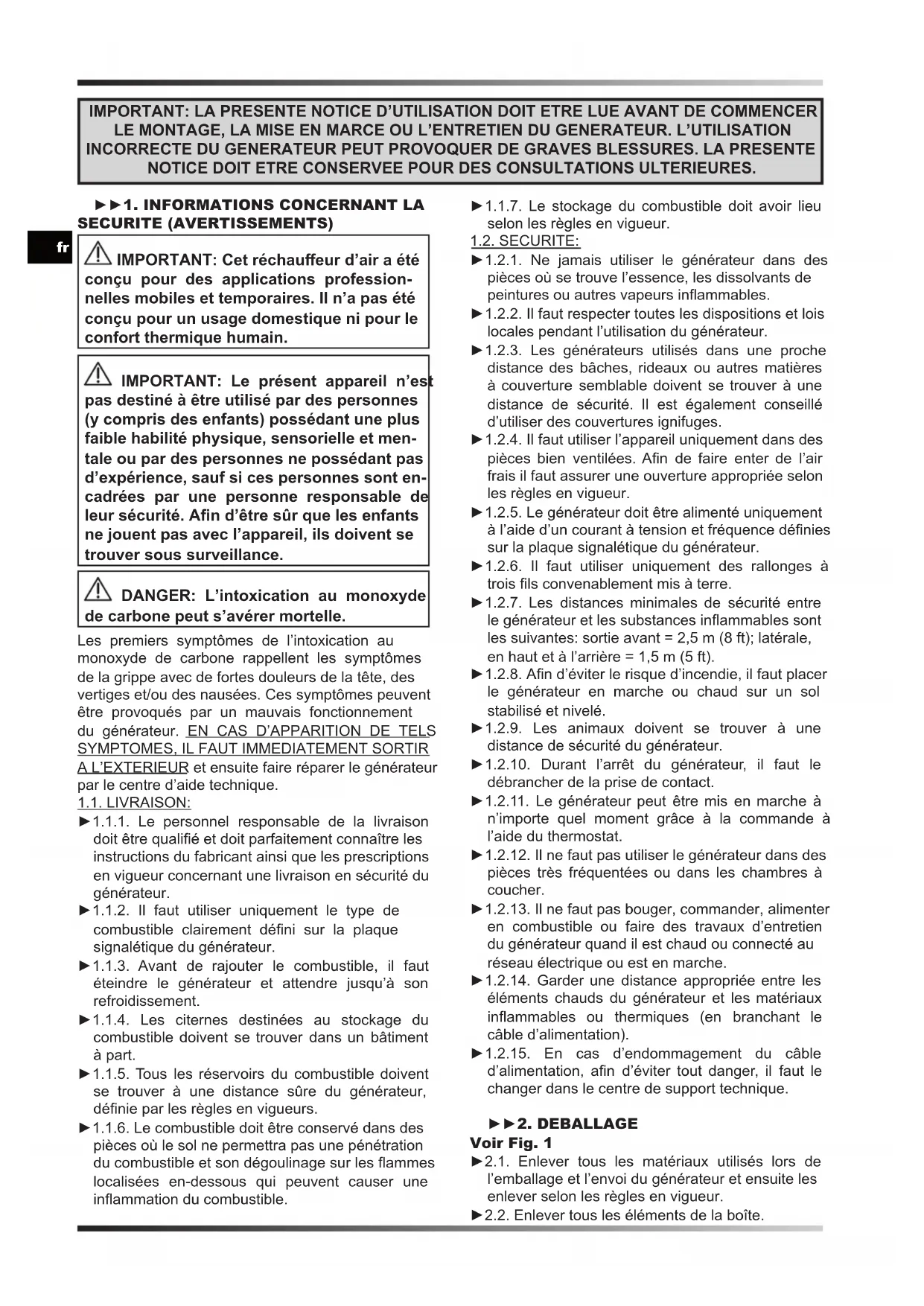 A L’EXTERIEUR et ensuite faire réparer le générateur par le centre d’aide technique. 1.1. LIVRAISON: ►1.1.1. Le personnel responsable de la livraison doit être qualié et doit parfaitement connaître les instructions du fabricant ainsi que les prescriptions en vigueur concernant une livraison en sécurité du générateur. ►1.1.2. Il faut utiliser uniquement le type de combustible clairement déni sur la plaque signalétique du générateur. ►1.1.3. Avant de rajouter le combustible, il faut éteindre le générateur et attendre jusqu’à son refroidissement. ►1.1.4. Les citernes destinées au stockage du combustible doivent se trouver dans un bâtiment à part. ►1.1.5. Tous les réservoirs du combustible doivent se trouver à une distance sûre du générateur, dénie par les règles en vigueurs. ►1.1.6. Le combustible doit être conservé dans des pièces où le sol ne permettra pas une pénétration du combustible et son dégoulinage sur les ammes localisées en-dessous qui peuvent causer une inammation du combustible. ►1.1.7. Le stockage du combustible doit avoir lieu selon les règles en vigueur. 1.2. SECURITE: ►1.2.1. Ne jamais utiliser le générateur dans des pièces où se trouve l’essence, les dissolvants de peintures ou autres vapeurs inammables. ►1.2.2. Il faut respecter toutes les dispositions et lois locales pendant l’utilisation du générateur. ►1.2.3. Les générateurs utilisés dans une proche distance des bâches, rideaux ou autres matières à couverture semblable doivent se trouver à une distance de sécurité. Il est également conseillé d’utiliser des couvertures ignifuges. ►1.2.4. Il faut utiliser l’appareil uniquement dans des pièces bien ventilées. An de faire enter de l’air frais il faut assurer une ouverture appropriée selon les règles en vigueur. ►1.2.5. Le générateur doit être alimenté uniquement à l’aide d’un courant à tension et fréquence dénies sur la plaque signalétique du générateur. ►1.2.6. Il faut utiliser uniquement des rallonges à trois ls convenablement mis à terre. ►1.2.7. Les distances minimales de sécurité entre le générateur et les substances inammables sont les suivantes: sortie avant = 2,5 m (8 ft); latérale, en haut et à l’arrière = 1,5 m (5 ft). ►1.2.8. An d’éviter le risque d’incendie, il faut placer le générateur en marche ou chaud sur un sol stabilisé et nivelé. ►1.2.9. Les animaux doivent se trouver à une distance de sécurité du générateur. ►1.2.10. Durant l’arrêt du générateur, il faut le débrancher de la prise de contact. ►1.2.11. Le générateur peut être mis en marche à n’importe quel moment grâce à la commande à l’aide du thermostat. ►1.2.12. Il ne faut pas utiliser le générateur dans des pièces très fréquentées ou dans les chambres à coucher. ►1.2.13. Il ne faut pas bouger, commander, alimenter en combustible ou faire des travaux d’entretien du générateur quand il est chaud ou connecté au réseau électrique ou est en marche. ►1.2.14. Garder une distance appropriée entre les éléments chauds du générateur et les matériaux inammables ou thermiques (en branchant le câble d’alimentation). ►1.2.15. En cas d’endommagement du câble d’alimentation, an d’éviter tout danger, il faut le changer dans le centre de support technique. ►►2. DEBALLAGE Voir Fig. 1 ►2.1. Enlever tous les matériaux utilisés lors de l’emballage et l’envoi du générateur et ensuite les enlever selon les règles en vigueur. ►2.2. Enlever tous les éléments de la boîte.