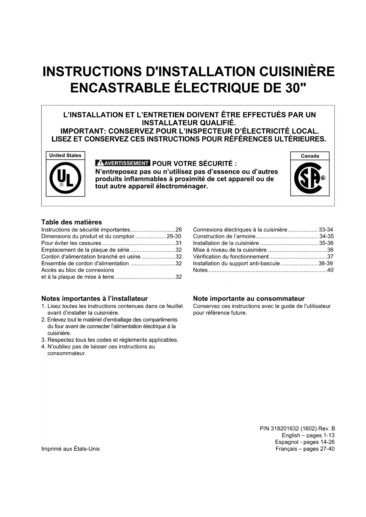 - consommateur. P/N 318201632 (1602) Rev. B English – pages 1-13 Espagnol - pages 14-26 Français – pages 27-40 Note importante au consommateur Conservez ces instructions avec le guide de l’utilisateur pour référence future. Table des matières Instructions de sécurité importantes p. 28