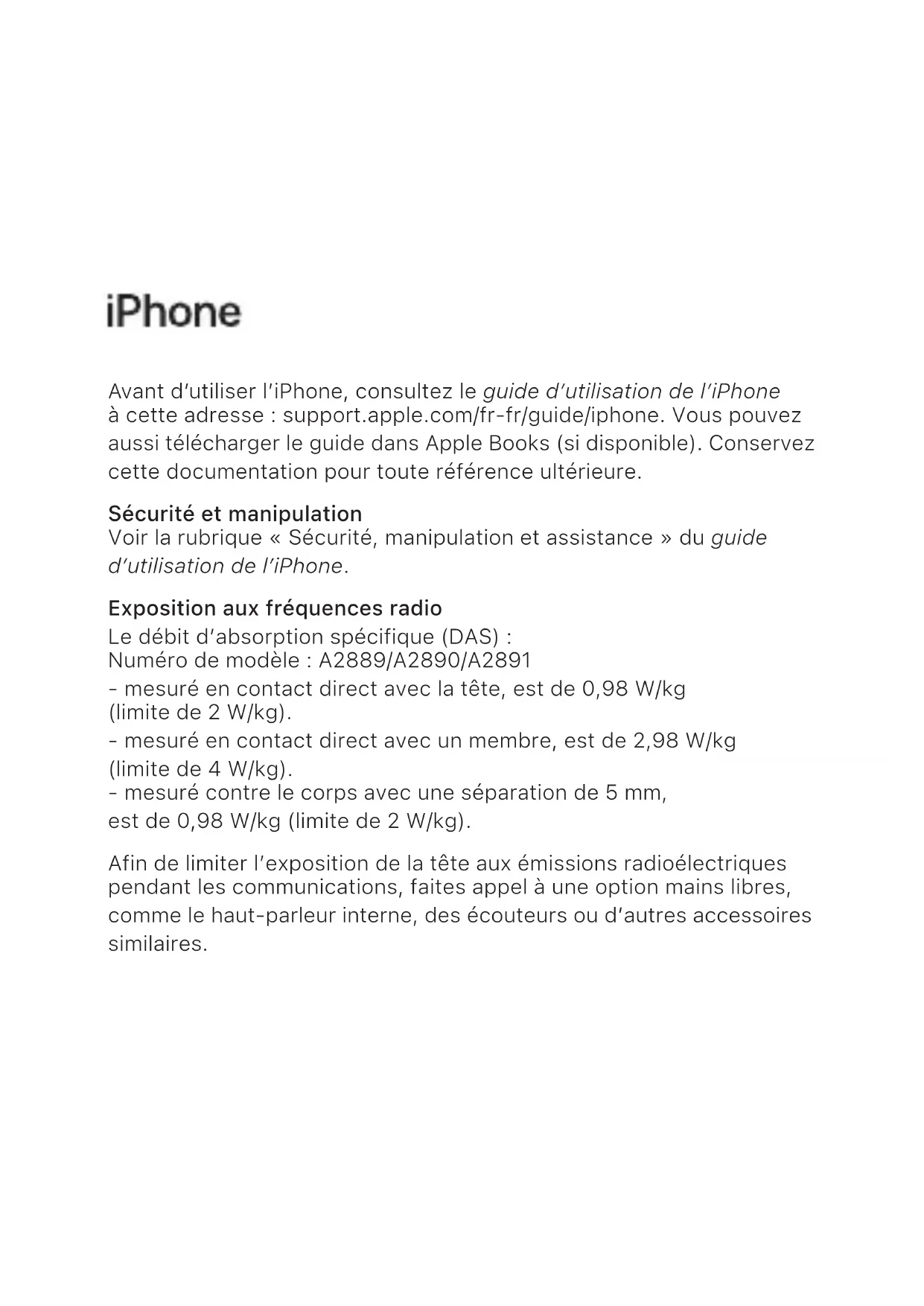 Avant d’utiliser l’iPhone, consultez le guide d’utilisation de l’iPhone à cette adresse: support.apple.com/fr-fr/guide/iphone. Vous pouvez aussi télécharger le guide dans AppleBooks (si disponible). Conservez cette documentation pour toute référence ultérieure. Sécurité et manipulation Voir la rubrique «Sécurité, manipulation et assistance» du guide d’utilisation de l’iPhone. Exposition aux fréquences radio Le débit d’absorption spécifique (DAS) : Numéro de modèle : A2889/A2890/A2891 - mesuré en contact direct avec la tête, est de 0,98 W/kg (limite de 2 W/kg). - mesuré en contact direct avec un membre, est de 2,98 W/kg (limite de 4 W/kg). - mesuré contre le corps avec une séparation de 5 mm, est de 0,98 W/kg (limite de 2 W/kg). Afin de limiter l’exposition de la tête aux émissions radioélectriques pendant les communications, faites appel à une option mains libres, comme le haut-parleur interne, des écouteurs ou d’autres accessoires similaires.Pour en savoir plus, sur votre iPhone, accédez à Réglages > Général > Mentions légales et certifications > Exposition aux RF. Vous pouvez également accéder à apple.com/fr/legal/rfexposure. Batterie et recharge La batterie d’un iPhone ne doit être remplacée que par un technicien formé afin d’éviter tout dommage, ce qui pourrait entraîner une surchauffe, un incendie ou des blessures. Les batteries doivent être recyclées ou éliminées séparément des ordures ménagères, et conformément aux lois et réglementations environnementales du pays. Pour en savoir plus sur les batteries lithium-ion d’Apple et sur leur entretien et leur recyclage, consultez la page apple.com/fr/batteries/ service-and-recycling. Pour en savoir plus sur la recharge, consultez la rubrique «Informations de sécurité importantes» du guide d’utilisation de l’iPhone. Lasers Le capteur de proximité, le système de caméra TrueDepth et le scanner LiDAR contiennent un ou plusieurs lasers. Ces systèmes laser peuvent être désactivés pour des raisons de sécurité si l’appareil est endommagé ou défectueux. Si vous recevez une notification sur votre iPhone indiquant que le système laser est désactivé, vous devez impérativement le faire réparer par Apple ou un centre de services agréé. Une réparation, une modification ou un usage inadéquat de composants Apple non authentiques dans les systèmes laser est susceptible d’empêcher les mécanismes de sécurité de fonctionner correctement et peut provoquer une exposition dangereuse et des blessures oculaires ou cutanées.Compatibilité avec les appareils auditifs (HAC) Consultez la page apple.com/support/hac, ou reportez-vous à la section «Appareils auditifs» du guide d’utilisation de l’iPhone. Prévention des pertes auditives Pour éviter les pertes auditives, baissez le volume et utilisez vos écouteurs avec modération. Vous trouverez de plus amples informations à propos du son et de l’audition sur apple.com/fr/sound et dans la section «Informations importantes concernant la sécurité» du guide d’utilisation de l’iPhone. Interférences avec les dispositifs médicaux L’iPhone contient des aimants, ainsi que des composants et/ou des radios pouvant interférer avec des appareils médicaux. Voir la rubrique «Informations importantes concernant la sécurité» du guide d’utilisation de l’iPhone. Certification Des informations sur les certifications et la réglementation sont disponibles sur l’appareil. Accédez à Réglages> Général> Mentions légales et certifications. Pour en savoir plus sur la réglementation, consultez la rubrique «Sécurité, manipulation et assistance» du guide d’utilisation de l’iPhone. Conformité aux normes FCC et ISDECanada Cet appareil est conforme à la partie15 des règles de la FCC et aux normes RSS pour les dispositifs exempts de licence d’ISDECanada. Son fonctionnement est soumis aux deux conditions suivantes:(1) cet appareil ne doit pas provoquer de brouillage préjudiciable, et (2) il doit accepter tout brouillage reçu, y compris le brouillage pouvant entraîner un mauvais fonctionnement. Conformité pour l’UE et le R.-U. AppleInc. déclare par la présente que cet appareil sans fil est conforme aux exigences stipulées dans la Directive 2014/53/EU et dans la réglementation relative aux équipements radio de 2017. Une copie de la déclaration de conformité est disponible à l’adresse apple.com/euro/compliance. Le représentant d’Apple dans l’UE est Apple Distribution International Ltd., Hollyhill Industrial Estate, Cork, Irlande. Le représentant d’Apple au Royaume-Uni est Apple UK Ltd., 2 Furzeground Way, Stockley Park, Middlesex, UB11 1BB. Restriction d’utilisation Fréquence Puissance maximale GSM 900 Power Class 4 GSM 1800 Power Class 1 3G (All Bands) Power Class 3 LTE/5G (1, 3, 7, 8, 20, 28, 38, 40, 42) Power Class 3Fréquence Puissance maximale 5G (41, 77, 78) Power Class 2 1610.0 - 1626.5 MHz < 27.5 dBm