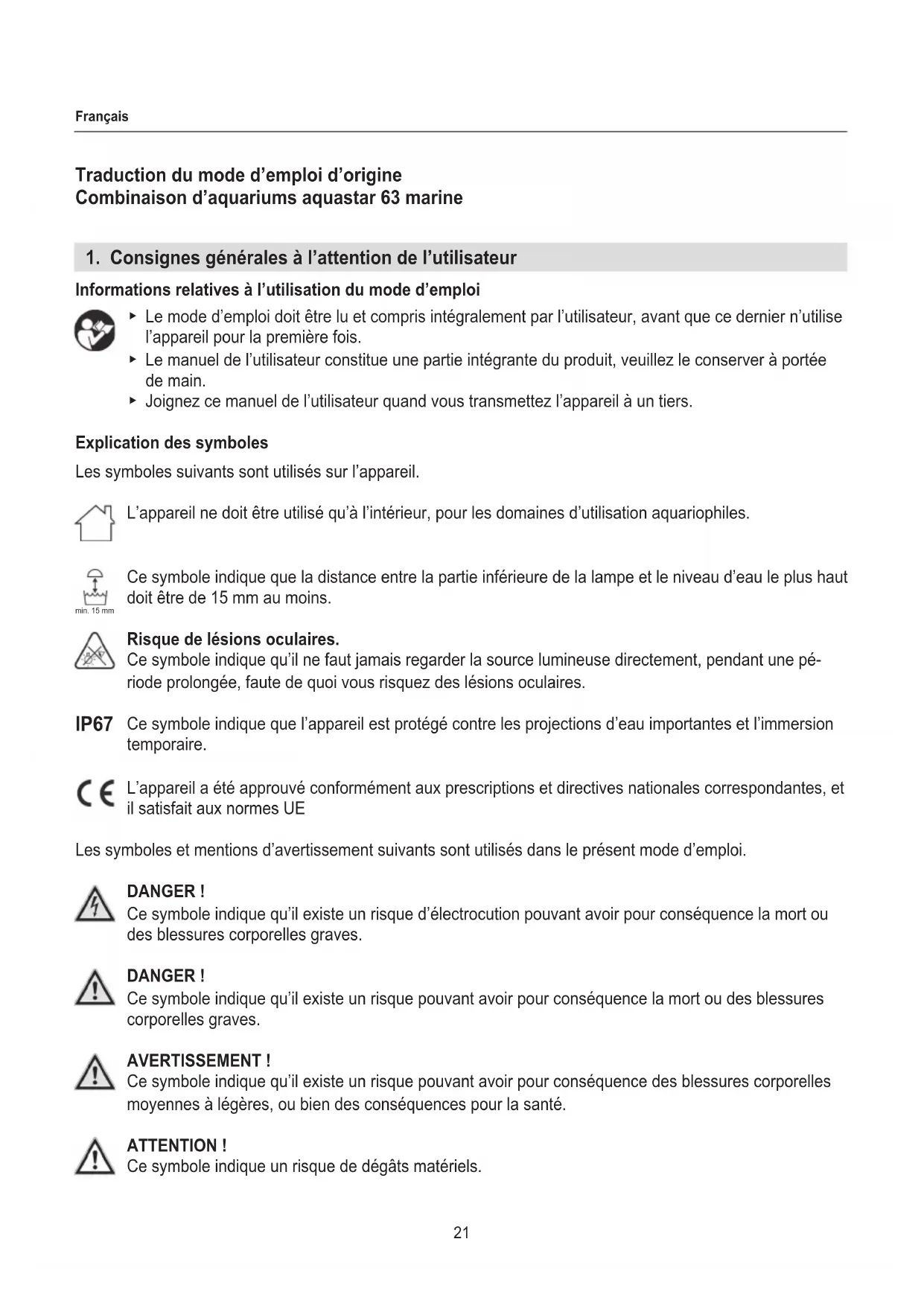 Informations relatives à l’utilisation du mode d’emploi ▶ Le mode d’emploi doit être lu et compris intégralement par l’utilisateur, avant que ce dernier n’utilise l’appareil pour la première fois. ▶ Le manuel de l’utilisateur constitue une partie intégrante du produit, veuillez le conserver à portée de main. ▶ Joignez ce manuel de l’utilisateur quand vous transmettez l’appareil à un tiers. Explication des symboles Les symboles suivants sont utilisés sur l’appareil. L’appareil ne doit être utilisé qu’à l’intérieur, pour les domaines d’utilisation aquariophiles. Ce symbole indique que la distance entre la partie inférieure de la lampe et le niveau d’eau le plus haut doit être de 15 mm au moins. Risque de lésions oculaires. Ce symbole indique qu’il ne faut jamais regarder la source lumineuse directement, pendant une pé- riode prolongée, faute de quoi vous risquez des lésions oculaires. Ce symbole indique que l’appareil est protégé contre les projections d’eau importantes et l’immersion temporaire. L’appareil a été approuvé conformément aux prescriptions et directives nationales correspondantes, et il satisfait aux normes UE Les symboles et mentions d’avertissement suivants sont utilisés dans le présent mode d’emploi. DANGER ! Ce symbole indique qu’il existe un risque d’électrocution pouvant avoir pour conséquence la mort ou des blessures corporelles graves. DANGER ! Ce symbole indique qu’il existe un risque pouvant avoir pour conséquence la mort ou des blessures corporelles graves. AVERTISSEMENT ! Ce symbole indique qu’il existe un risque pouvant avoir pour conséquence des blessures corporelles moyennes à légères, ou bien des conséquences pour la santé. ATTENTION ! Ce symbole indique un risque de dégâts matériels. min. 15 mm IP6722 Français Conseils et informations utiles. Convention de présentation Renvoi à une illustration, ici à la gure A Vous êtes invité(e) à exécuter une action.