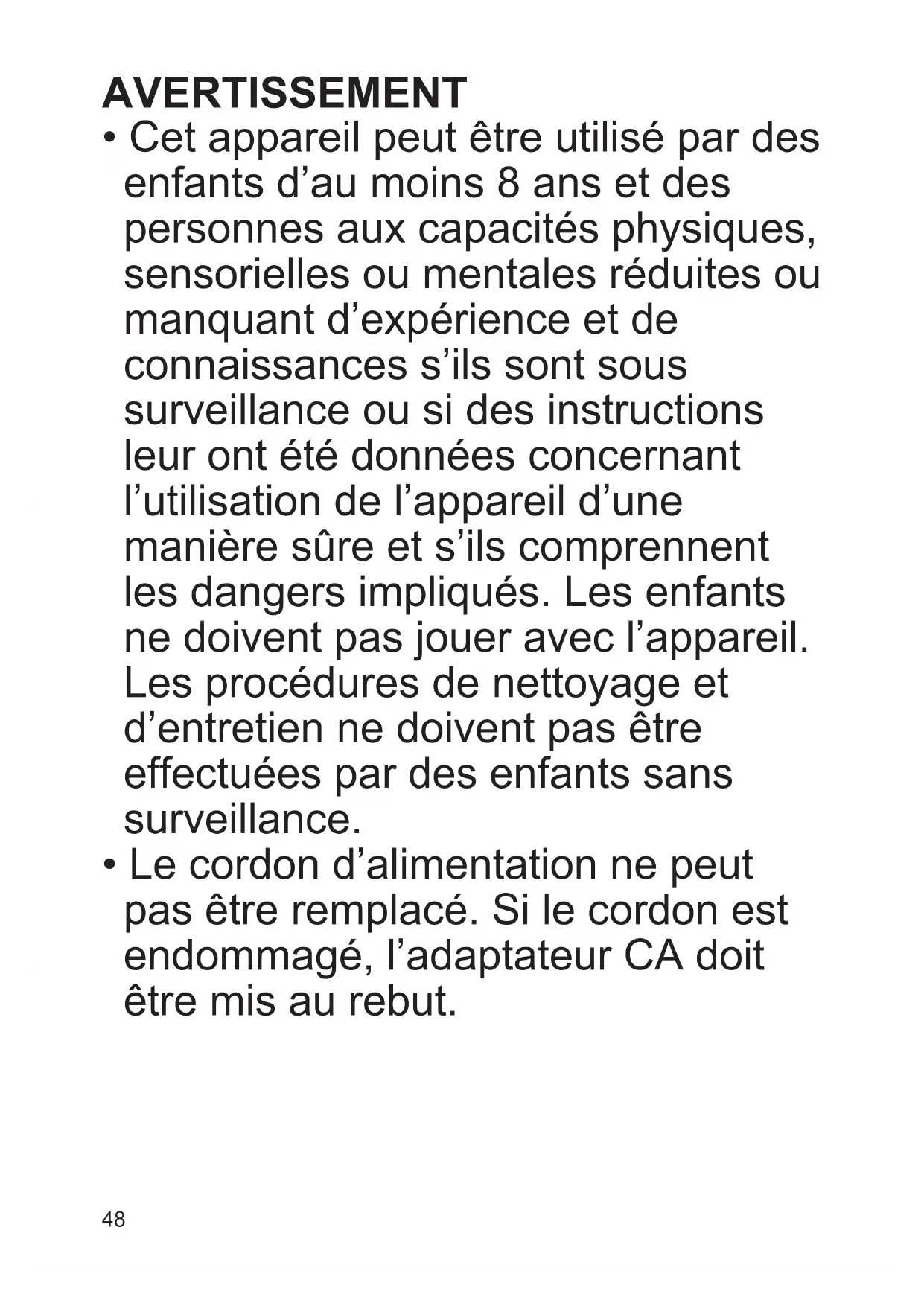 - Cet appareil peut être utilisé par des enfants d’au moins 8 ans et des personnes aux capacités physiques, sensorielles ou mentales réduites ou manquant d’expérience et de connaissances s’ils sont sous surveillance ou si des instructions leur ont été données concernant l’utilisation de l’appareil d’une manière sûre et s’ils comprennent les dangers impliqués. Les enfants ne doivent pas jouer avec l’appareil. Les procédures de nettoyage et d’entretien ne doivent pas être effectuées par des enfants sans surveillance.