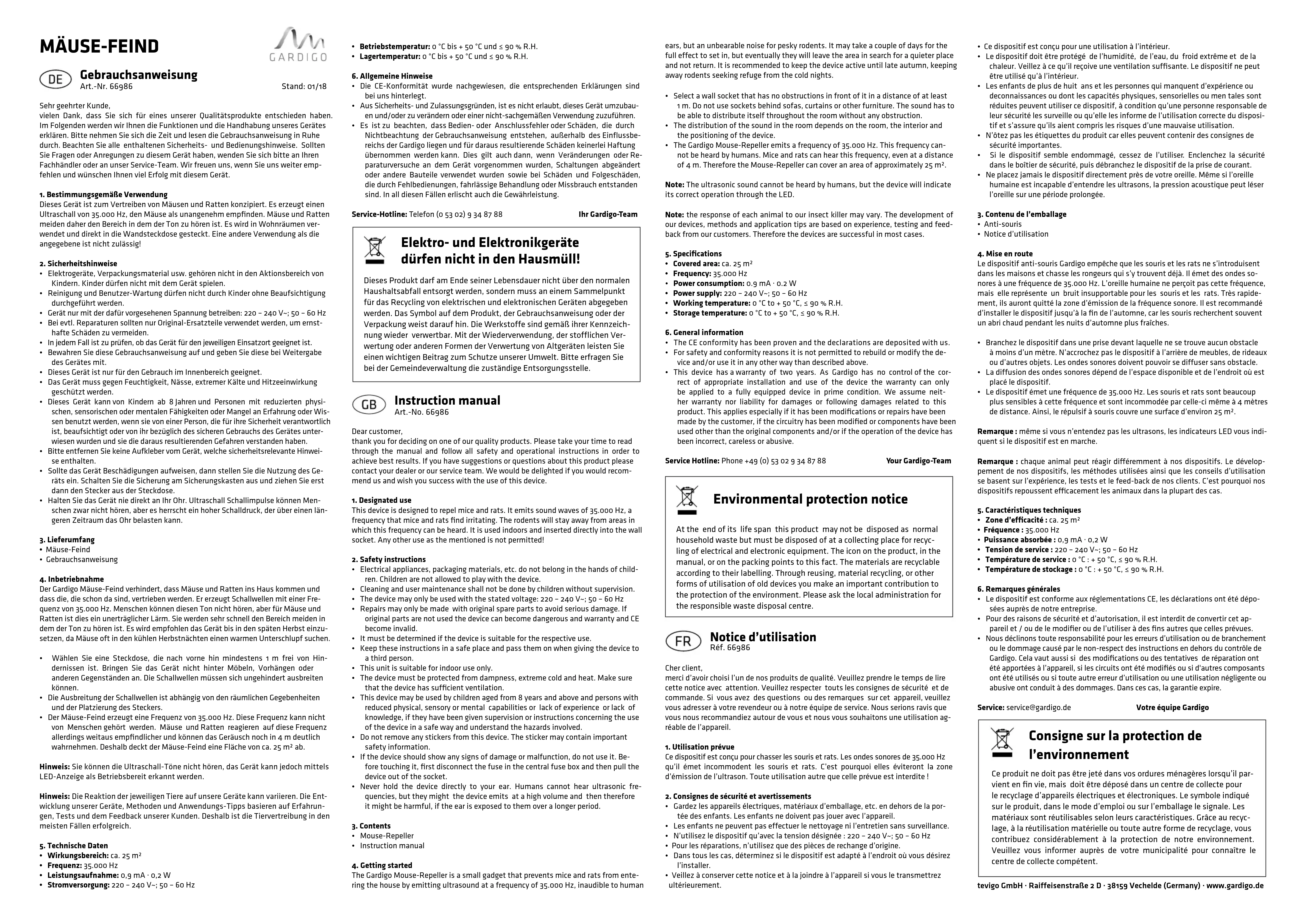 - Si le dispositif semble endommagé, cessez de l’utiliser. Enclenchez la sécurité dans le boîtier de sécurité, puis débranchez le dispositif de la prise de courant.• Ne placez jamais le dispositif directement près de votre oreille. Même si l’oreille humaine est incapable d’entendre les ultrasons, la pression acoustique peut léser l’oreille sur une période prolongée.3. Contenu de l’emballage• Anti-souris • Notice d’utilisation4. Mise en route Le dispositif anti-souris Gardigo empêche que les souris et les rats ne s’introduisent dans les maisons et chasse les rongeurs qui s’y trouvent déjà. Il émet des ondes so-nores à une fréquence de 35.000 Hz. L’oreille humaine ne perçoit pas cette fréquence, mais elle représente un bruit insupportable pour les souris et les rats. Très rapide-ment, ils auront quitté la zone d’émission de la fréquence sonore. Il est recommandé d’installer le dispositif jusqu’à la fin de l’automne, car les souris recherchent souvent un abri chaud pendant les nuits d’automne plus fraîches.• Branchez le dispositif dans une prise devant laquelle ne se trouve aucun obstacle à moins d’un mètre. N’accrochez pas le dispositif à l’arrière de meubles, de rideaux ou d’autres objets. Les ondes sonores doivent pouvoir se diffuser sans obstacle.• La diffusion des ondes sonores dépend de l’espace disponible et de l’endroit où est placé le dispositif.• Le dispositif émet une fréquence de 35.000 Hz. Les souris et rats sont beaucoup plus sensibles à cette fréquence et sont incommodée par celle-ci même à 4 mètres de distance. Ainsi, le répulsif à souris couvre une surface d’environ 25 m².Remarque : même si vous n’entendez pas les ultrasons, les indicateurs LED vous indi-quent si le dispositif est en marche. Remarque: chaque animal peut réagir diéremment à nos dispositifs. Le dévelop- pement de nos dispositifs, les méthodes utilisées ainsi que les conseils d’utilisation se basent sur l’expérience, les tests et le feed-back de nos clients. C’est pourquoi nos dispositifs repoussent ecacement les animaux dans la plupart des cas. 5. Caractéristiques techniques• Zone d’efficacité : ca. 25 m²• Fréquence : 35.000 Hz• Puissance absorbée : 0,9 mA · 0,2 W• Tension de service : 220 – 240 V~; 50 – 60 Hz• Température de service : 0 °C : + 50 °C, ≤ 90 % R.H. • Température de stockage : 0 °C : + 50 °C, ≤ 90 % R.H.6. Remarques générales• Le dispositif est conforme aux réglementations CE, les déclarations ont été dépo-sées auprès de notre entreprise.• Pour des raisons de sécurité et d’autorisation, il est interdit de convertir cet ap-pareil et / ou de le modifier ou de l’utiliser à des fins autres que celles prévues.• Nous déclinons toute responsabilité pour les erreurs d’utilisation ou de branchement ou le dommage causé par le non-respect des instructions en dehors du contrôle de Gardigo. Cela vaut aussi si des modifications ou des tentatives de réparation ont été apportées à l’appareil, si les circuits ont été modifiés ou si d'autres composants ont été utilisés ou si toute autre erreur d’utilisation ou une utilisation négligente ou abusive ont conduit à des dommages. Dans ces cas, la garantie expire. Service: service@gardigo.de Votre équipe Gardigo Consigne sur la protection de l’environnement Ce produit ne doit pas être jeté dans vos ordures ménagères lorsqu’il par- vient en fin vie, mais doit être déposé dans un centre de collecte pour le recyclage d’appareils électriques et électroniques. Le symbole indiqué sur le produit, dans le mode d’emploi ou sur l’emballage le signale. Les matériaux sont réutilisables selon leurs caractéristiques. Grâce au recyc- lage, à la réutilisation matérielle ou toute autre forme de recyclage, vous contribuez considérablement à la protection de notre environnement. Veuillez vous informer auprès de votre municipalité pour connaître le centre de collecte compétent. tevigo GmbH · Raiffeisenstraße 2 D · 38159 Vechelde (Germany) · www.gardigo.deManual de instrucciones Art.-No. 66986 Estimado cliente, le agradecemos que haya elegido uno de nuestros productos de calidad. A continuaci- ón explicamos en detalle las funciones y el manejo de nuestro aparato. Tómese algo de tiempo para leer las instrucciones con atención hasta el final. Tenga en cuenta todas las indicaciones de seguridad y manejo. Si tiene alguna pregunta o algún comentario acerca de este aparato, póngase en contacto con su distribuidor o con nuestro equipo de atención al cliente. Le agradeceríamos que nos recomendara y le deseamos muchos éxitos con el uso de este.