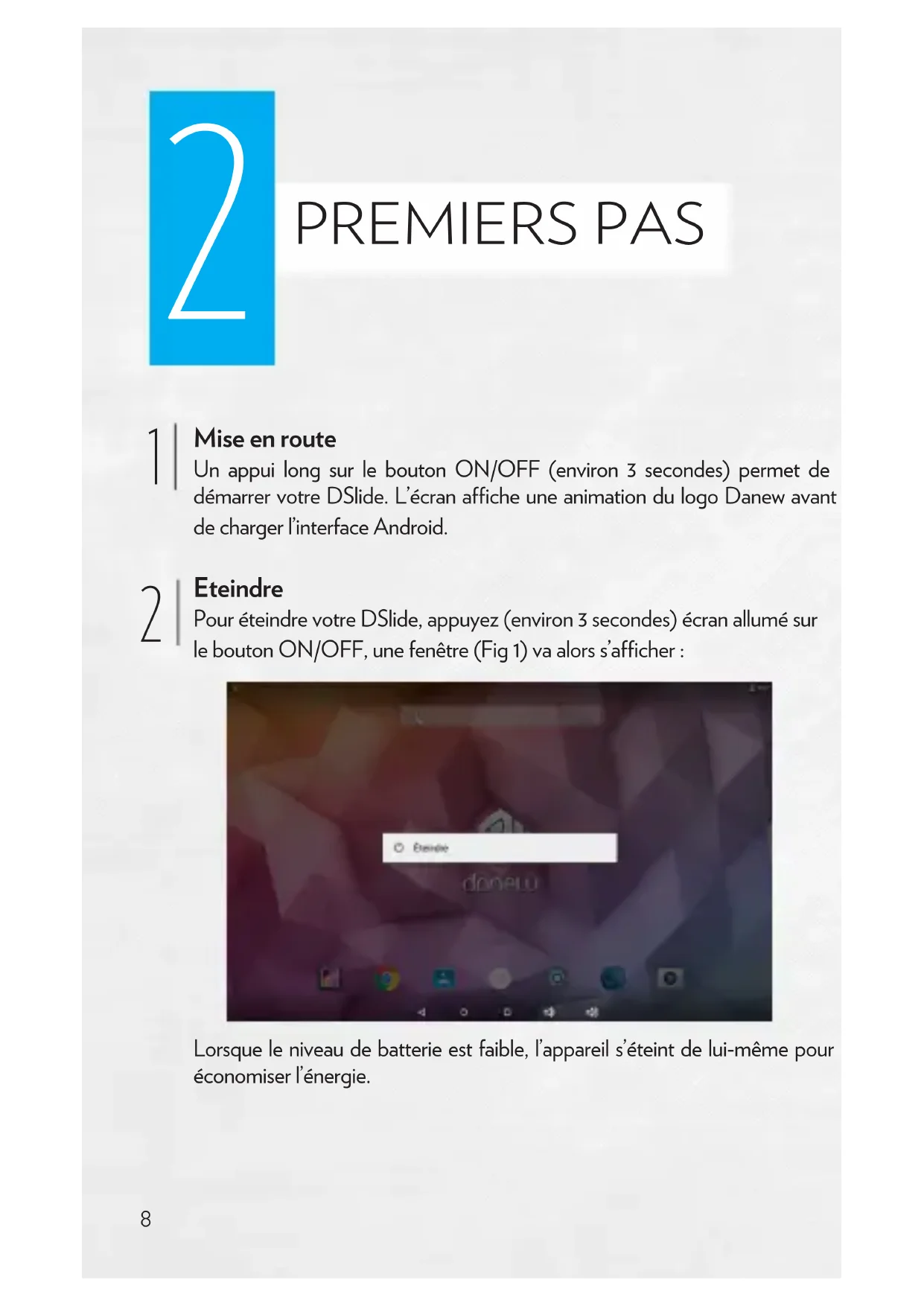 Un appui long sur le bouton ON/OFF (environ 3 secondes) permet de démarrer votre DSlide. L’écran ache une animation du logo Danew avant de charger l’interface Android. Pour éteindre votre DSlide, appuyez (environ 3 secondes) écran allumé sur le bouton ON/OFF, une fenêtre (Fig 1) va alors s’acher : Lorsque le niveau de batterie est faible, l’appareil s’éteint de lui-même pour économiser l’énergie. Mise en route Eteindre9