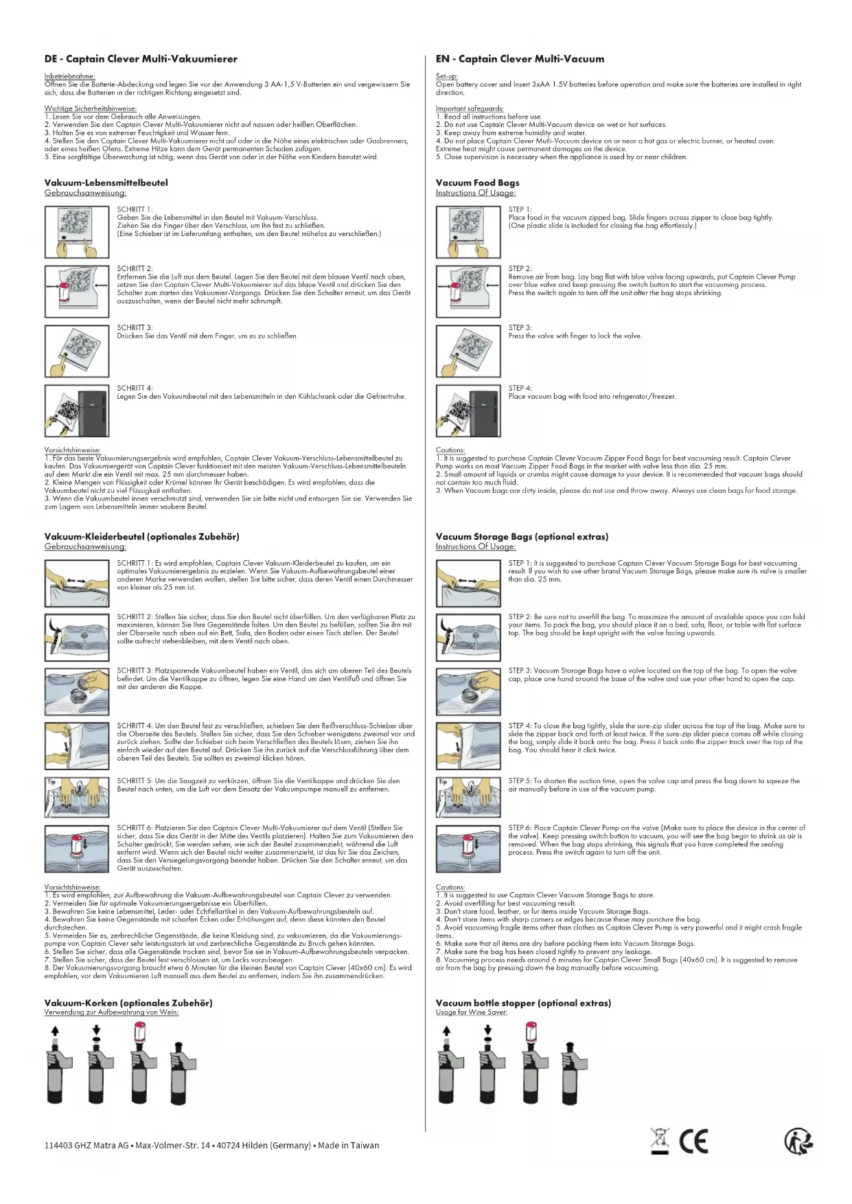 est recommandé d9extraire l9air du sac en le comprimant. 114403 GHZ Matra AG • Max-Volmer-Str. 14 • 40724 Hilden (Germany) • Made in Taiwan Sacs de rangement sous vide (accessoire en option) Consignes d´utilisation: Bouchon sous vide (accessoire en option) Utilisation pour système de conservation du vin: ÉTAPE 1: Il est recommandé d'acheter des sacs à vêtements Captain Clever pour des résultats d'aspiration optimaux. Si vous voulez utiliser d9autres sacs de rangement sous vide, assurez-vous que leur valve est inférieure à dia. 25 mm. ÉTAPE 3: Les sacs sous vide peu encombrants possèdent une valve située en haut. Pour ouvrir le bouchon de la valve, tenez la base de la valve d9une main et utilisez l9autre pour soulever le bouchon. ÉTAPE 4: Pour bien fermer le sac, glissez la glissière sure-zip sur le dessus du sac. Veillez à faire au moins deux allers-retours. Si le curseur se bloque lors de la fermeture du sac, il vous suffit de le faire retourner en arrière. Poussez-le en arrière sur la fermeture à glissière située en haut du sac. Vous devez entendre deux clics. ÉTAPE 5: Pour raccourcir le temps d'aspiration, ouvrez le capuchon de la valve et appuyez sur le sac pour retirer l'air manuellement avant d'utiliser la pompe à vide. ÉTAPE 6: Placez Captain Clever dispositif de vide sur la valve (veillez à positionner Captain Clever dispositif de vide au centre de la valve). Maintenez l9interrupteur appuyé pour mettre sous vide. Vous verrez le sac rétrécir au fur et à mesure que l9air est enlevé. Lorsque le sac s9arrête de rétrécir, cela veut dire que vous avez terminé le scellement. Appuyez de nouveau sur l'interrupteur pour éteindre l'appareil. ÉTAPE 1: Placez des aliments dans le sac sous vide avec fermeture à glissière. Faites glisser le curseur de la fermeture à glissière pour bien fermer le sac. (Une glissière est incluse pour fermer le sac sans effort). ÉTAPE 2: Enlevez l9air du sac. Placez le sac avec la valve bleue vers le haut, placez le Captain Clever dispositif de vide sur la valve bleue et appuyez sur l'interrupteur pour démarrer le processus d'aspiration. Appuyez de nouveau sur l'interrupteur pour éteindre l'appareil après que le sac a cessé de rétrécir. ÉTAPE 3: Appuyez sur la valve avec le doigt pour la verrouiller. ÉTAPE 4: Placez le sac sous vide rempli d9aliments dans un réfrigérateur ou un garde-manger. Sacs sous vide pour stockage alimentaire Consignes d9utilisation: ÉTAPE 2: Veillez à ne pas surcharger le sac. Pour maximiser l9espace disponible, vous pouvez plier vos affaires. Pour remplir le sac, il est recommandé de le poser sur un lit, un canapé, par terre ou sur une table avec une surface plane. Le sac doit être maintenu bien droit et la valve doit être dirigée vers le haut. NL - Captain Clever-multi-vacuümsysteem Eerste gebruik: Open vóór gebruik het klepje van het batterijencompartiment en doe er 3 AA 1.5V-batterijen in; zorg ervoor dat de batterijen goed om zitten. Belangrijke Veiligheidsinstructies: