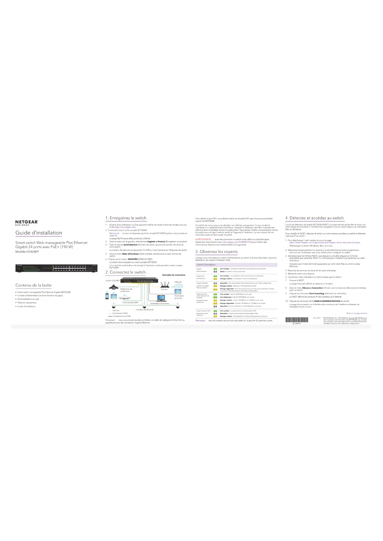 switch.6. Cliquez sur le bouton REGISTER (ENREGISTRER).Le switch est enregistré sur votre compte NETGEAR.Un e-mail de conrmation est envoyé à l'adresse e-mail associée à votre compte NETGEAR.Avril2021© NETGEAR, Inc., NETGEAR et le logo NETGEAR sont des marques commerciales de NETGEAR, Inc. Toutes les marques commerciales autres que NETGEAR sont utilisées à des ns de référence uniquement.Suite sur la page suivante. Smart switch Web manageable Plus Ethernet Gigabit 24 ports avec PoE+ (190W) Modèle GS324EP Contenu de la boîte
