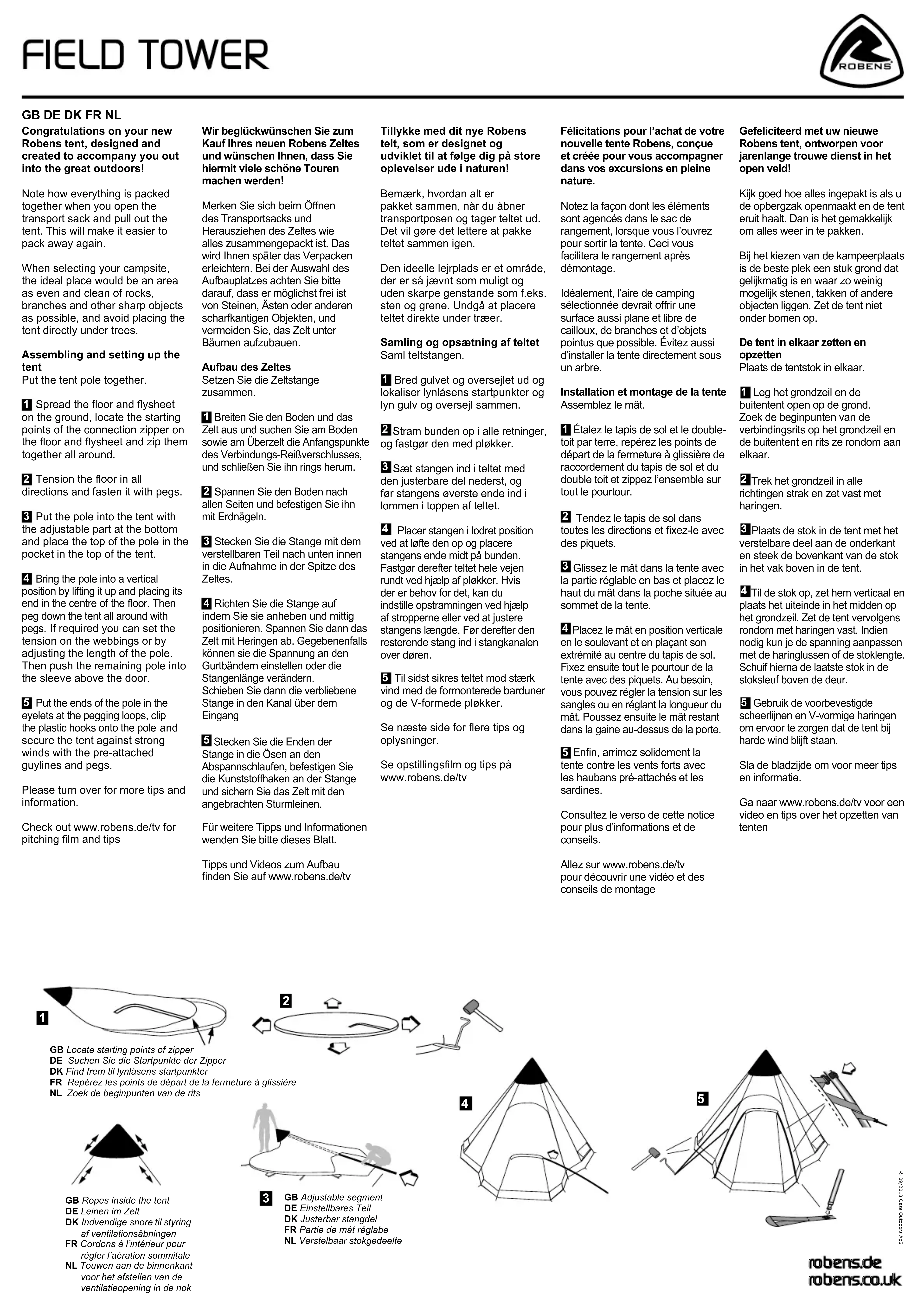 Til sidst sikres teltet mod stærk vind med de formonterede barduner og de V-formede pløkker. Se næste side for ere tips og oplysninger. Se opstillingslm og tips på www.robens.de/tv Félicitations pour l’achat de votre nouvelle tente Robens, conçue et créée pour vous accompagner dans vos excursions en pleine nature. Notez la façon dont les éléments sont agencés dans le sac de rangement, lorsque vous l’ouvrez pour sortir la tente. Ceci vous facilitera le rangement après démontage. Idéalement, l’aire de camping sélectionnée devrait orir une surface aussi plane et libre de cailloux, de branches et d’objets pointus que possible. Évitez aussi d’installer la tente directement sous un arbre. Installation et montage de la tente Assemblez le mât.