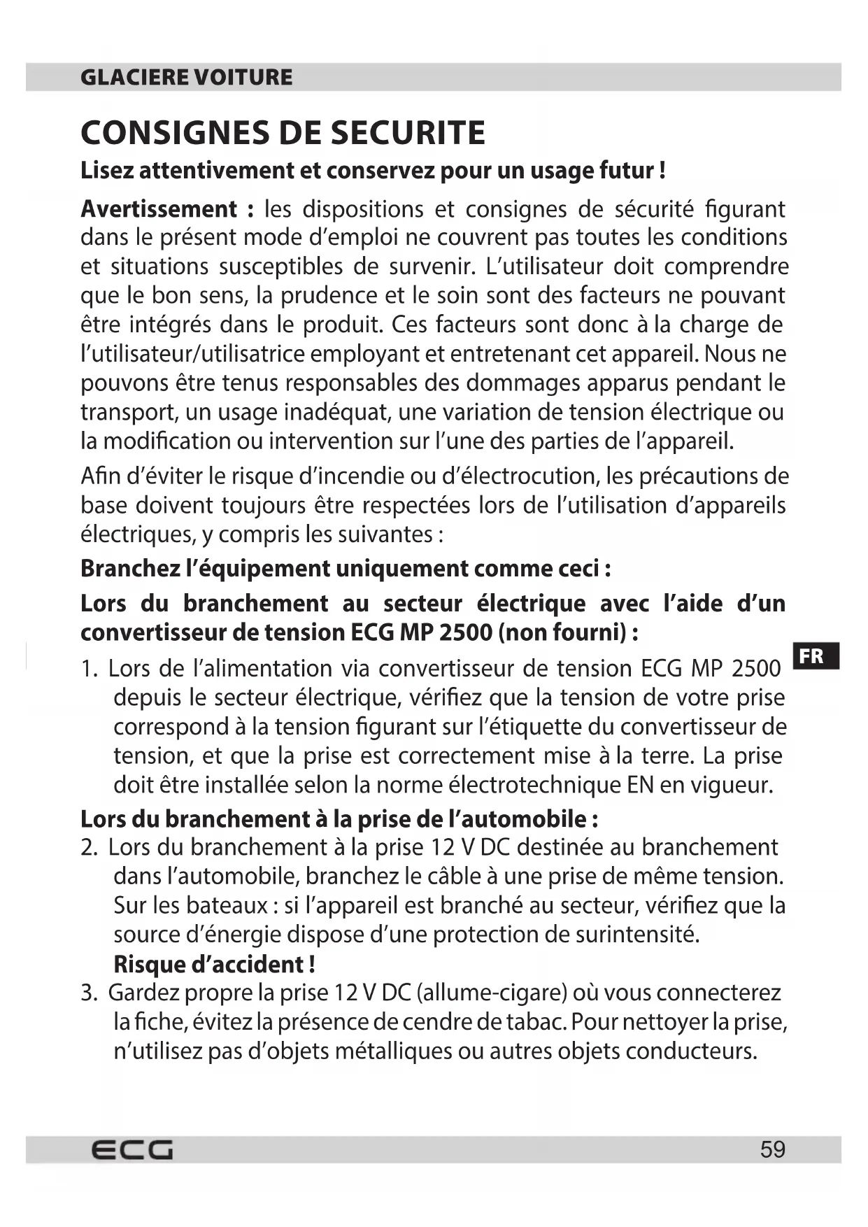 Problème Cause possible Solution La glacière voiture ne fonctionne pas. La prise 12V DC (allume-cigare) de la voiture est hors tension. Pour la plupart des modèles de voiture, le moteur doit être en marche an que l’allume-cigare soit sous tension. Absence de courant électrique dans la prise où la glacière voiture est branchée (en cas d’utilisation d’un adaptateur ECG MP 2500). Essayez de brancher la glacière àune autre prise. La glacière voiture ne refroidit pas. Le ventilateur interne ou la glacière sont endommagés. Ce défaut doit être réparé par un centre de service après-vente agréé.FRFR