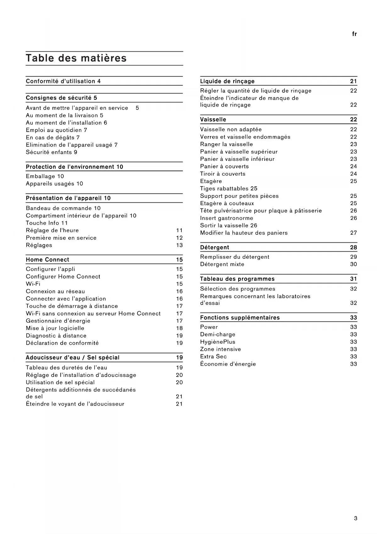 Table des matières Mode d’emploi Conformité d’utilisation 4 Consignes de sécurité 5 Avant de mettre l’appareil en service 5 Au moment de la livraison 5 Au moment de l’installation 6 Emploi au quotidien 7 En cas de dégâts 7 Elimination de l’appareil usagé 7 Sécurité enfants 9 Protection de l'environnement 10 Emballage 10 Appareils usagés 10 Présentation de l'appareil 10 Bandeau de commande 10 Compartiment intérieur de l’appareil 10 Touche Info 11 Réglage de l'heure 11 Première mise en service 12 Réglages 13 Home Connect 15 Configurer l’appli 15 Configurer Home Connect 15 Wi-Fi 15 Connexion au réseau 16 Connecter avec l’application 16 Touche de démarrage à distance 17 Wi-Fi sans connexion au serveur Home Connect 17 Gestionnaire d’énergie 17 Mise à jour logicielle 18 Diagnostic à distance 19 Déclaration de conformité 19 Adoucisseur d’eau / Sel spécial 19 Tableau des duretés de l’eau 19 Réglage de l’installation d’adoucissage 20 Utilisation de sel spécial 20 Détergents additionnés de succédanés de sel 21 Éteindre le voyant de l’adoucisseur 21 Liquide de rinçage 21 Régler la quantité de liquide de rinçage 22 Éteindre l’indicateur de manque de liquide de rinçage 22 Vaisselle 22 Vaisselle non adaptée 22 Verres et vaisselle endommagés 22 Ranger la vaisselle 23 Panier à vaisselle supérieur 23 Panier à vaisselle inférieur 23 Panier à couverts 24 Tiroir à couverts 24 Etagère 25 Tiges rabattables 25 Support pour petites pièces 25 Etagère à couteaux 25 Tête pulvérisatrice pour plaque à pâtisserie 26 Insert gastronorme 26 Sortir la vaisselle 26 Modifier la hauteur des paniers 27 Détergent 28 Remplisser du détergent 29 Détergent mixte 30 Tableau des programmes 31 Sélection des programmes 32 Remarques concernant les laboratoires d’essai 32 Fonctions supplémentaires 33 Power 33 Demi-charge 33 HygiènePlus 33 Zone intensive 33 Extra Sec 33 Économie d'énergie 33fr Conformité d’utilisation